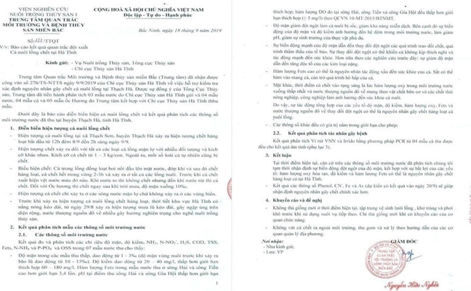 Ông Nguyễn Công Hoàng, Chi cục Trưởng Chi cục Thủy sản Hà Tĩnh, cho biết: Kết quả xác định nguyên nhân cá chết của Viện Nghiên cứu Nuôi trồng thủy sản và các cơ quan liên quan đều cho rằng hiện tượng cá, ngao chết trong thời gian qua trên sông Nghèn là do “sốc nước” khi độ mặn ở vùng nước nuôi bị giảm đột ngột. Điều này xuất phát từ việc mưa lũ kéo dài, nước từ thượng nguồn đổ về cộng với việc cống Đò Điểm xả lũ mang theo vật chất hữu cơ và các chất thải nông nghiệp, công nghiệp gây ảnh hưởng làm cá, ngao nuôi bị chết.