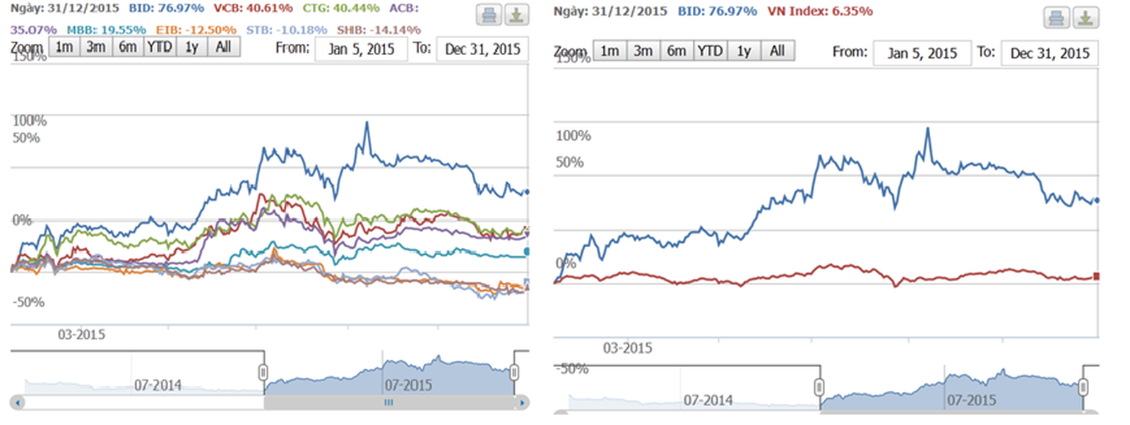 Năm 2015, BID là cổ phiếu có mức tăng giá cao nhất trong nhóm cổ phiếu ngân hàng, BID tăng 77% trong khi VCB và CTG tăng lần lượt 40,61%, 40,44% so với đầu năm. Mức tăng trưởng của BID rất ấn tượng trong khi mức tăng của chỉ số VnIndex là 6,35%, và mức tăng trung bình của nhóm 8 ngân hàng niêm yết (22%). Việc cổ phiếu BID tăng giá mạnh như vậy trong năm vừa qua tương đồng với xu hướng chung của nhóm cổ phiếu ngân hàng được đánh giá là đến từ những thông tin hỗ trợ mang tính cơ bản chứ không chỉ mang tính đầu cơ thuần túy.