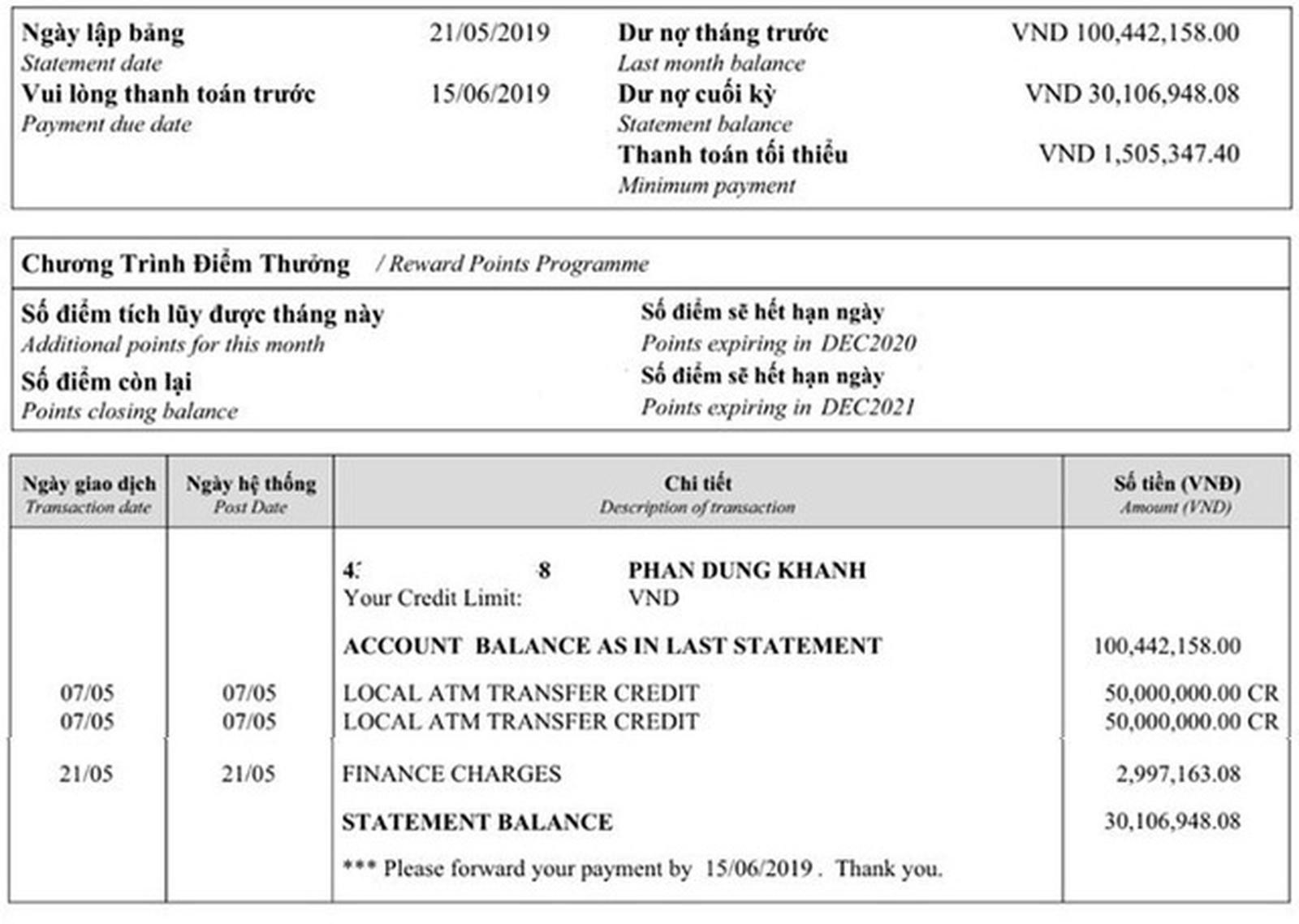 Anh Khánh cho biết, trong tháng 4, anh đã sử dụng số tiền là 100,4 triệu đồng thanh toán thẻ tín dụng, và kỳ hạn trả trước 16/5 (không bị tính lãi). Ngày 7/5, Anh Khánh trả ngân hàng 100 triệu đồng còn nợ ngân hàng 400.000 đồng