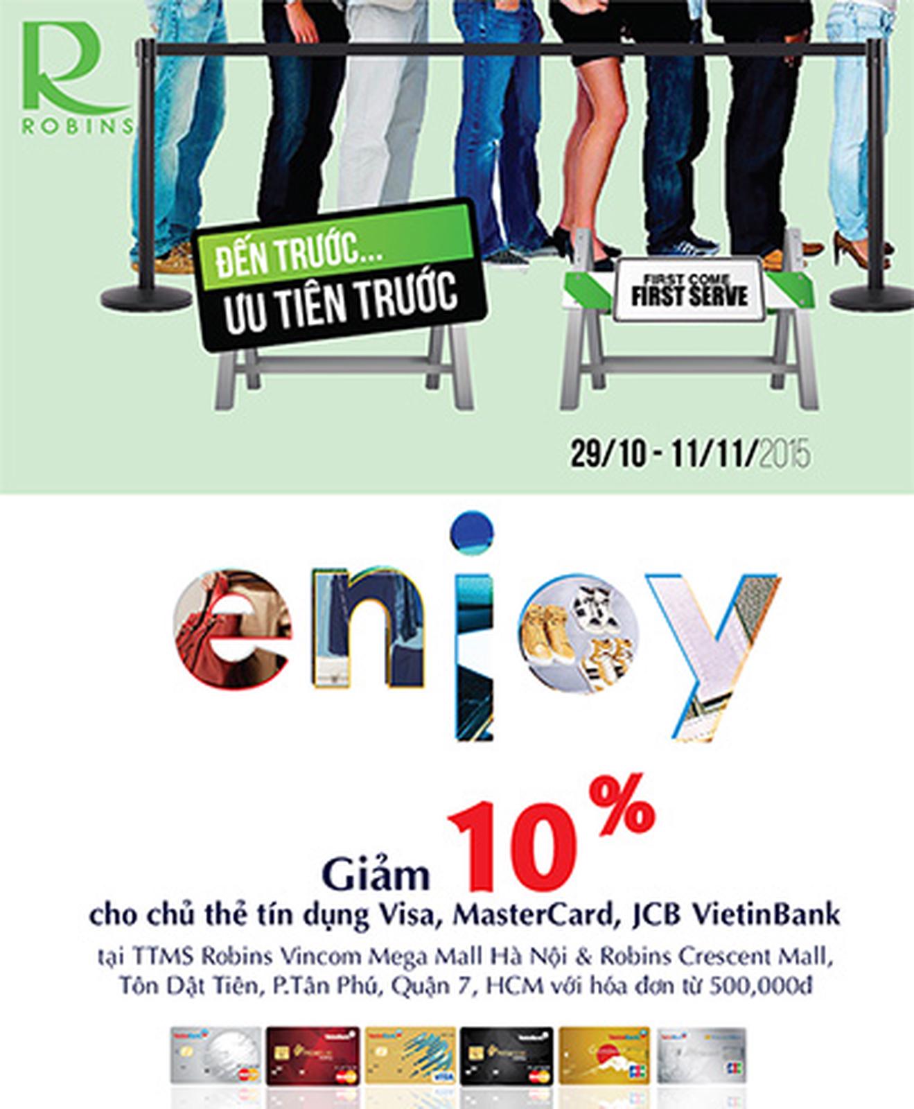 Từ ngày 29/10/2015 đến 8/11/2015, VietinBank tiếp tục triển khai Chương trình khuyến mãi đặc biệt dành riêng cho chủ thẻ tín dụng quốc tế Visa/MasterCard/JCB VietinBank khi mua hàng và thanh toán trên POS VietinBank tại hệ thống Trung tâm Mua sắm ROBINS (ROBINS) trên toàn quốc.