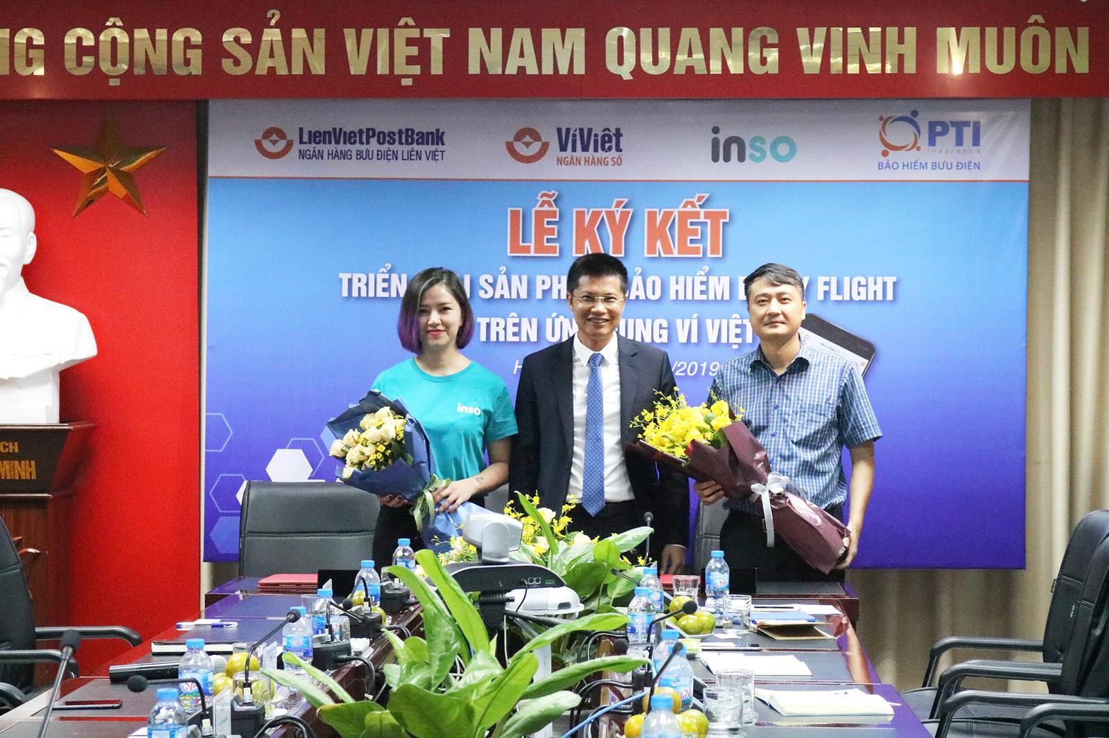 Bên phải ngoài cùng: Ông Dương Trọng Chữ, Giám đốc Khối Ngân hàng số Ngân hàng Bưu điện Liên Việt. Ở giữa: Ông Đoàn Kiên, PTGĐ PTI. Bên trái ngoài cùng: Bà Vũ Nguyễn Thùy Vân, Giám đốc Công ty Cổ phần INSO Việt Nam chụp ảnh lưu niệm