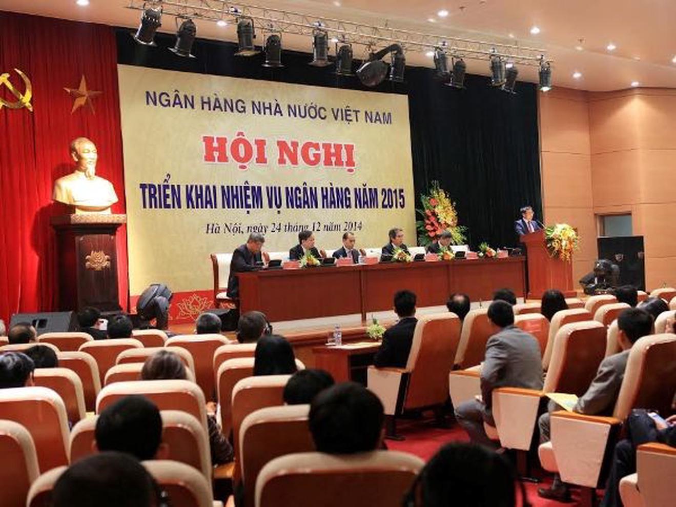 Thống đốc nhấn mạnh, mục tiêu trong năm tới sẽ giữ ổn định thị trường ngoại hối và mức điều chỉnh không quá 2%. Lãnh đạo Ngân hàng Nhà nước cũng rằng, điều hành ổn định tỷ giá và thị trường ngoại hối, bảo đảm giá trị đồng Việt Nam, tiếp tục triển khai hiệu quả các giải pháp quản lý thị trường vàng là một trong tám nhiệm vụ và lĩnh vực trọng tâm của ngành ngân hàng trong năm 2015. Khoảng biến động tỷ giá 2% trong năm 2015 cũng là khoảng định hướng như một cam kết mà nhà điều hành đưa ra và đã thực hiện được trong ba năm trước.Cũng trong năm 2015, Thống đốc cho biết, ngành ngân hàng phấn đấu kiểm soát tổng phương tiện thanh toán tăng khoảng 16-18%, tín dụng tăng khoảng 13-15%; điều hành ổn định tỷ giá và thị trường ngoại hối, đảm bảo giá trị đồng Việt Nam, tiếp tục triển khai có hiệu quả các giải pháp quản lý thị trường vàng; thực hiện các giải pháp về lãi suất, tín dụng nhằm hỗ trợ các doanh nghiệp vay vốn, tập trung vào vốn cho các lĩnh vực ưu tiên, các dự án hiệu quả và tạo ra nhiều việc làm.Ngoài ra, Ngân hàng Nhà nước sẽ tiếp tục triển khai đồng bộ, quyết liệt đề án cơ cấu lại hệ thống các tổ chức tín dụng, đề án xử lý nợ xấu; tăng cường công tác thanh tra, giám sát nhằm đảm bảo an toàn hoạt động và kỷ cương, kỷ luật trong hoạt động ngân hàng.Năm 2014 là năm thứ ba liên tiếp Ngân hàng Nhà nước thực hiện đúng cam kết ổn định tỷ giá, mức biến động không quá 2%. “Đến giờ này tỷ giá mới chỉ điều chỉnh hơn 1%, song quan trọng hơn là Ngân hàng Nhà nước đã chủ động điều chỉnh,” Thống đốc cho biết.Đối với thị trường vàng, lãnh đạo Ngân hàng Nhà nước cũng khẳng định, thị trường vàng năm qua tiếp tục diễn biến ổn định, Ngân hàng Nhà nước không phải tổ chức đấu thầu bán vàng miếng, góp phần hạn chế việc sử dụng ngoại tệ của Quỹ Bình ổn tỷ giá và giá vàng để nhập khẩu vàng trên thị trường quốc tế. Diễn biến ổn định của thị trường vàng đã góp phần duy trì sự ổn định của tỷ giá, thị trường ngoại hối, tăng dự trữ ngoại hối Nhà nước và ổn định kinh tế vĩ mô.“Thị trường vàng trong nước từ chỗ biến động, gây bất ổn cho hoạt động ngành ngân hàng, tác động tiêu cực trong điều hành chính sách tiền tệ, đã trở nên hết sức ổn định mặc dù thị trường vàng thế giới biến động mạnh. Nếu bình thường như trước đây thì đó là môi trường hết sức thuận lợi cho các hoạt động đầu cơ nhưng thời gian qua, các hoạt động đầu cơ hầu như được loại bỏ. Điều đó thể hiện các chính sách đã đúng hướng, hoạt động dự báo phân tích cũng ngày càng được nâng lên, thể hiện sự chính xác cao,” Thống đốc Nguyễn Văn Bình khẳng định. Mặt bằng lãi suất cho vay cũng đã giảm mạnh, từ mức 18 - 24%, thì đến nay, mặc bằng lãi suất đã được đưa về 10%, giảm 2% so với đầu năm đúng như mục tiêu đã đề ra. Ảnh minh họa. (Nguồn: TTXVN)Khẳng định thành công trong điều hành chính sách tiền tệ đã góp phần tích cực vào ổn định kinh tế vĩ mô, kiểm soát lạm phát ở mức thấp trong mấy năm qua, Thống đốc dẫn chứng, ví dụ năm 2013, Quốc hội, Chính phủ đặt mục tiêu kiểm soát lạm phát dưới 7%. Tuy nhiên, thực tế điều hành chính sách tiền tệ chủ đồng linh hoạt đã góp phần kiểm soát lạm phát dưới 6%. Năm 2014 cũng vậy, Quốc hội, Chính phủ đặt mục tiêu kiểm soát lạm phát dưới 6%, song đến nay lạm phát chỉ ở mức rất thấp. Ngay cả loại trừ yếu tố bất thường là giá dầu giảm mạnh thì lạm phát cũng chỉ khoảng 4,9%.Có được thành công này là nhờ chính sách được điều hành nhất quán, kiên trì; hoạt động phân tích dự báo được cải thiện; công tác tổ chức thực hiện hết sức quyết liệt."Chưa có lúc nào sự gắn kết các cấp từ trung ương đến địa phương, ngân hàng thương mại được phối hợp nhuần nhuyễn thông suốt như trong thời gian qua," Thống đốc chia sẻ.Phát biểu tại hội nghị, Phó Chủ tịch nước Nguyễn Thị Doan khẳng định: Trong những năm qua, với điều kiện nợ xấu cao, thị trường tiền tệ thế giới có nhiều diễn biến phức tạp... đã ảnh hưởng đến an toàn của hệ thống ngân hàng. Song Ngân hàng Nhà nước đã chủ động, kiên định và nhất quán chính sách tiền tệ và đã tạo được niềm tin trong nhân dân và niềm tin đối với các nhà đầu tư. Phó Chủ tịch nước cũng nhận định, là một ngành kinh doanh đặc biệt, ngân hàng đã giữ vai trò quan trọng trong lưu thông tiền tệ, chi phối toàn diện sự phát triển kinh tế, xã hội, an ninh của đất nước. Thành tích của ngành ngân hàng năm qua khẳng định bản lĩnh trí tuệ, sáng tạo, sự năng động của đội ngũ lãnh đạo và chuyên viên ngành ngân hàng. Bên cạnh đó, ngành ngân hàng cũng đã góp phần tích cực vào việc thực hiện chính sách an sinh xã h