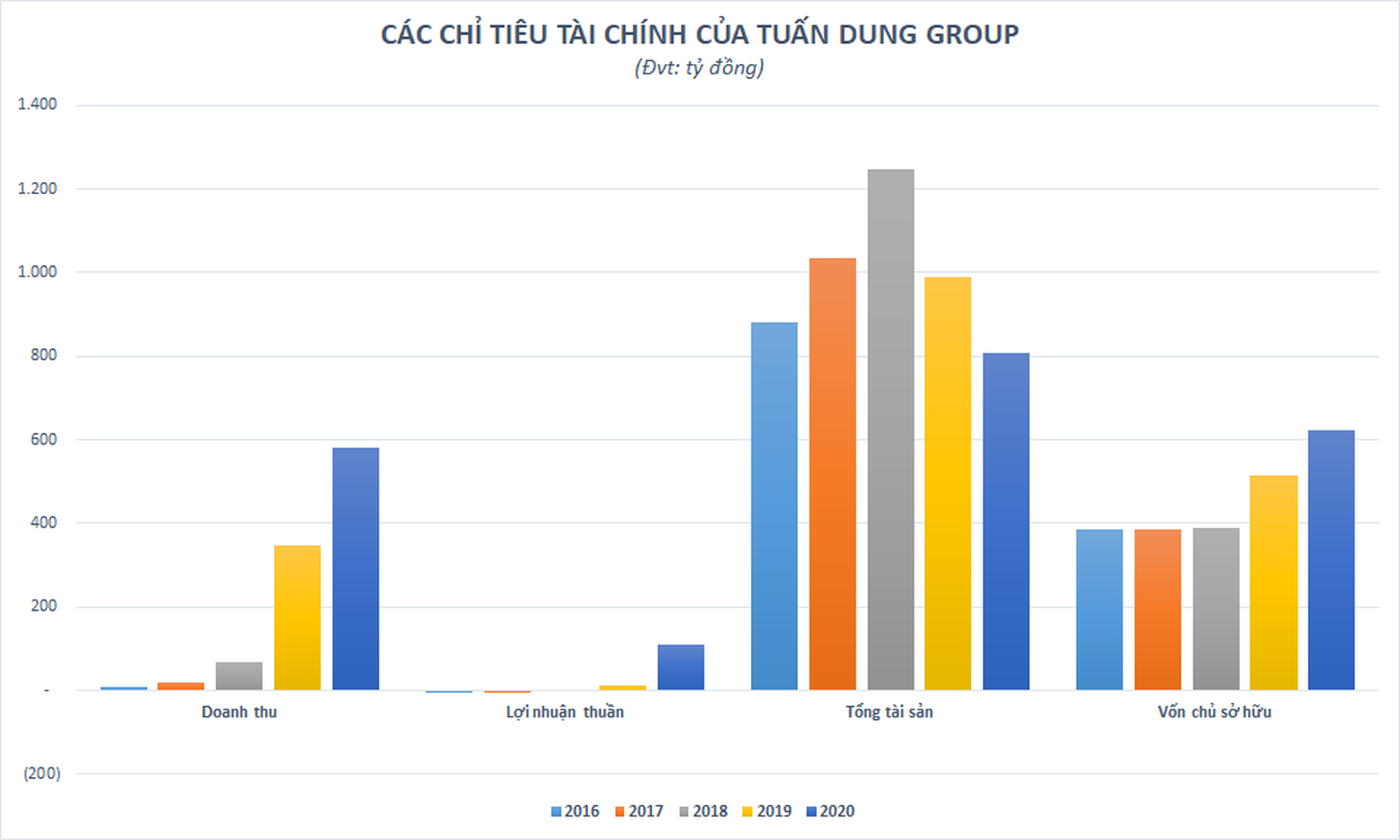 Vốn chủ sở hữu cũng theo đó tăng vọt từ khoảng xấp xỉ 390 tỷ đồng trong giai đoạn 3 năm 2016 - 2018 lên 514 tỷ đồng vào cuối năm 2019 và tiếp tục tăng lên gần 624 tỷ đồng vào cuối năm 2020. Ngược lại, tổng tài sản của Tuấn Dung Group lại liên tục sụt giảm từ mức gần 1.250 tỷ đồng cuối năm 2018 xuống còn 808 tỷ đồng vào cuối năm 2020. Quy mô tài sản thậm chí đã thu hẹp xuống mức thấp hơn cả năm 2016.