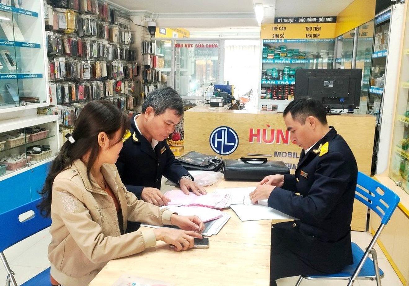 Cán bộ ngành Thuế kiểm tra, hướng dẫn khai thuế cho các hộ kinh doanh trên địa bàn huyện Than Uyên. Ảnh: Thu Trang
