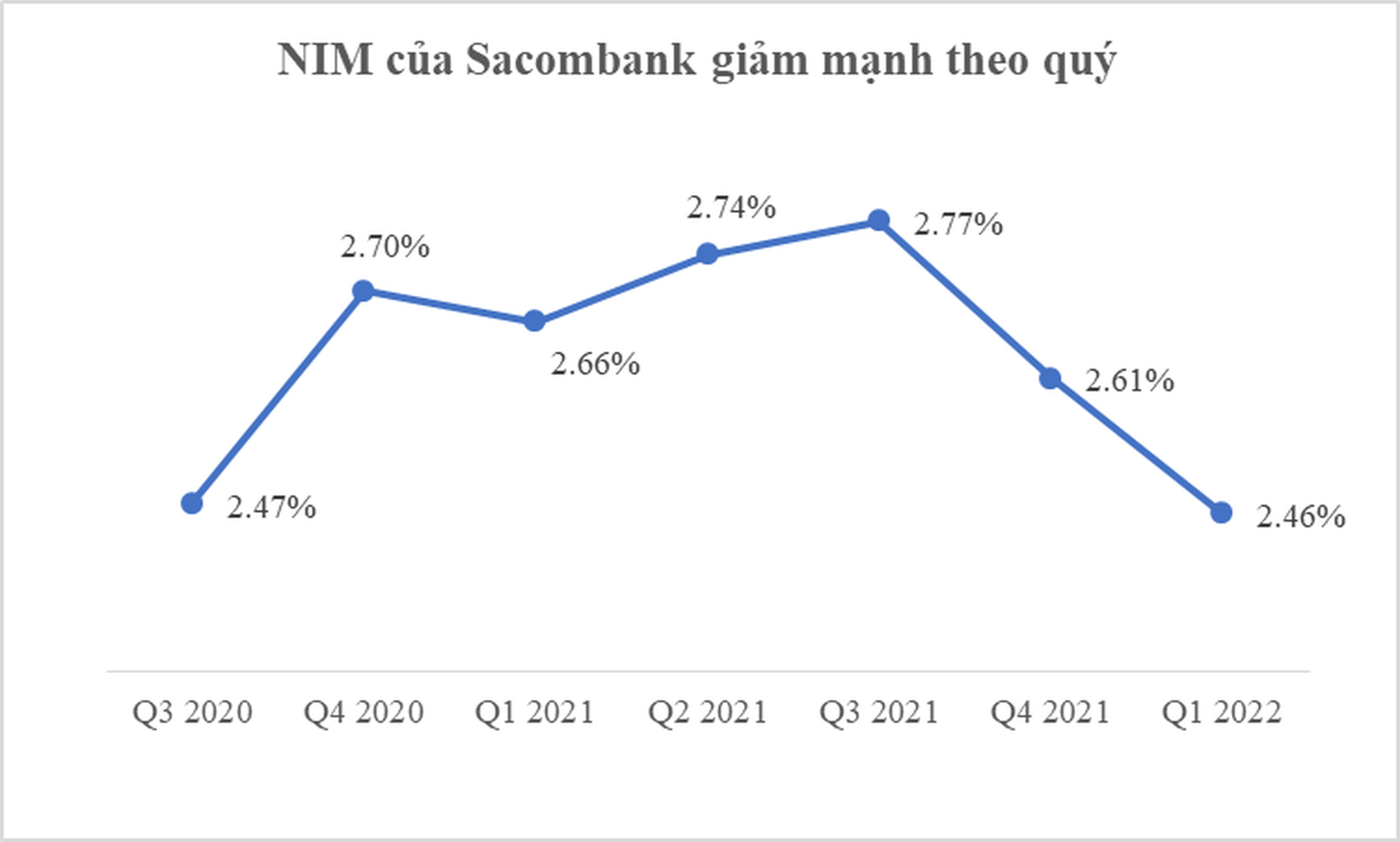 Trong quý 1/2022, tổng thu nhập hoạt động của Sacombank đạt 5.125 tỷ đồng (tăng 23,6% so với cùng kỳ), trong đó thu nhập lãi thuần đạt hơn 2.739 tỷ đồng (giảm 8,9%) và thu nhập ngoài lãi đạt 2.385 tỷ đồng (tăng 109,8%). Thu nhập lãi thuần có sự sụt giảm so với cùng kỳ dù tăng trưởng tín dụng trong quý 1/2022 đạt hơn 6,5% so với mức chỉ 4,9% cùng kỳ năm 2021.
