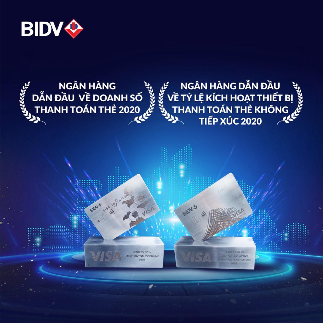 Sở hữu số lượng thẻ lớn và phủ rộng khắp thế giới cũng như Việt Nam, các giải thưởng do Tổ chức thẻ Quốc tế Visa trao tặng là những giải thưởng uy tín và danh giá, khẳng định vị thế của Ngân hàng tại thị trường thẻ trong nước. Trong năm 2020, tổ chức Thẻ Quốc tế Visa đánh giá cao những chỉ số vượt trội trong hoạt động thanh toán Thẻ và công nghệ thanh toán không tiếp xúc mà BIDV đã đạt được so với các tổ chức khác trên thị trường.