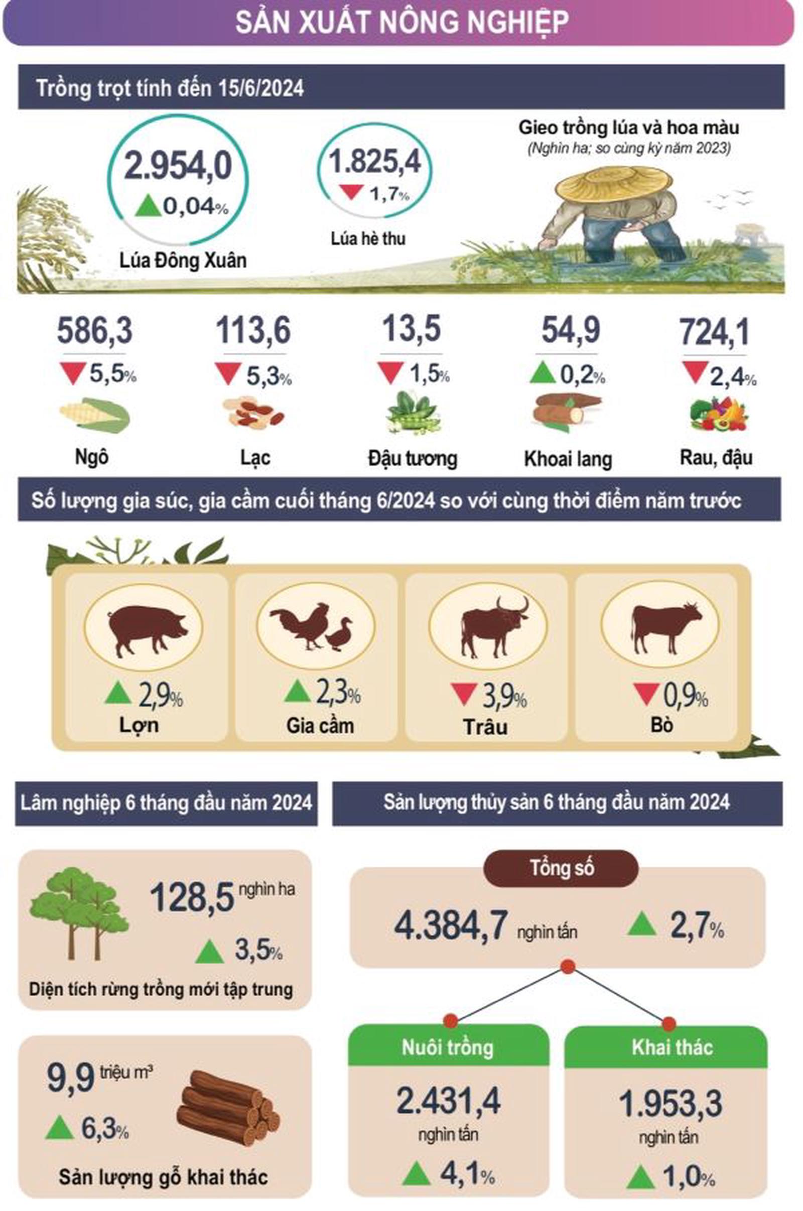 Theo số liệu từ Tổng cục Thống kê, sản xuất nông nghiệp 6 tháng đầu năm 2024 duy trì tăng trưởng ổn định, sản lượng lúa và nhiều cây trồng tăng so với cùng kỳ. Xuất khẩu tăng cao, kim ngạch xuất khẩu nhóm hàng nông, lâm sản đạt 16,64 tỷ USD, tăng 25% so với cùng kỳ năm 2023.