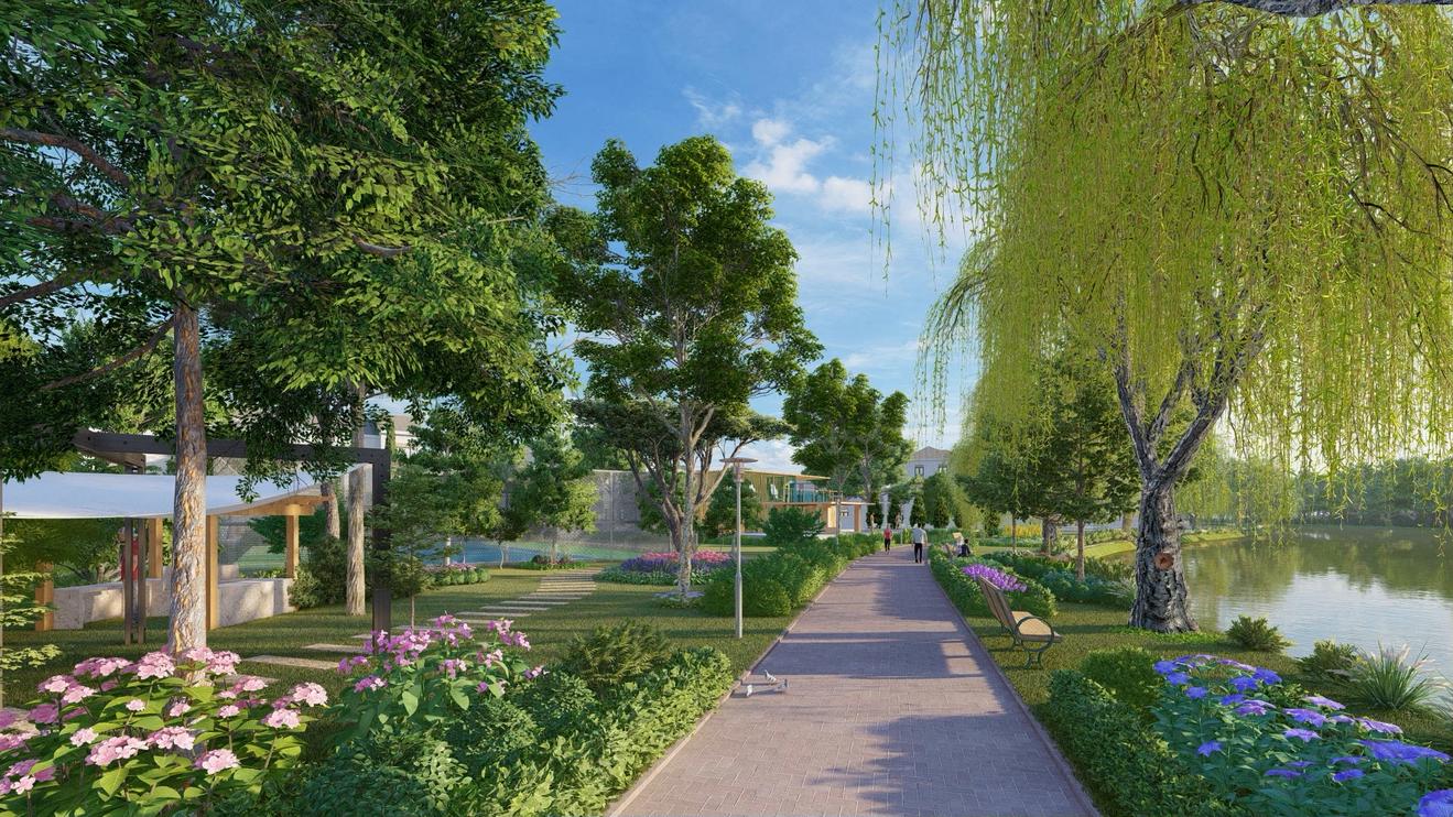 | Không gian xanh bao phủ, đường chạy bộ dọc bờ sông yên tĩnh tại Aqua City. |