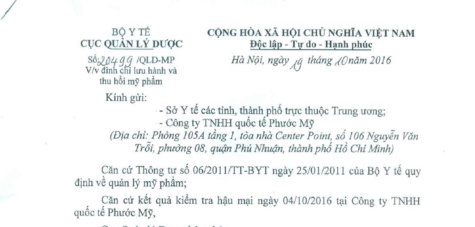 Cục Quản lý Dược cũng yêu cầu công ty này phải gửi báo cáo thu hồi các sản phẩm trên về Cục Quản lý Dược trước ngày 12/11/2016. Trước việc đình chỉ và thu hồi sản phẩm của Công ty TNHH Quốc tế Phước Mỹ, Cục Quản lý Dược yêu cầu Sở Y tế TP HCM kiểm tra, giám sát việc thu hồi các mỹ phẩm nêu trên của Công ty TNHH Quốc tế Phước Mỹ và chịu trách nhiệm báo cáo về Cục.