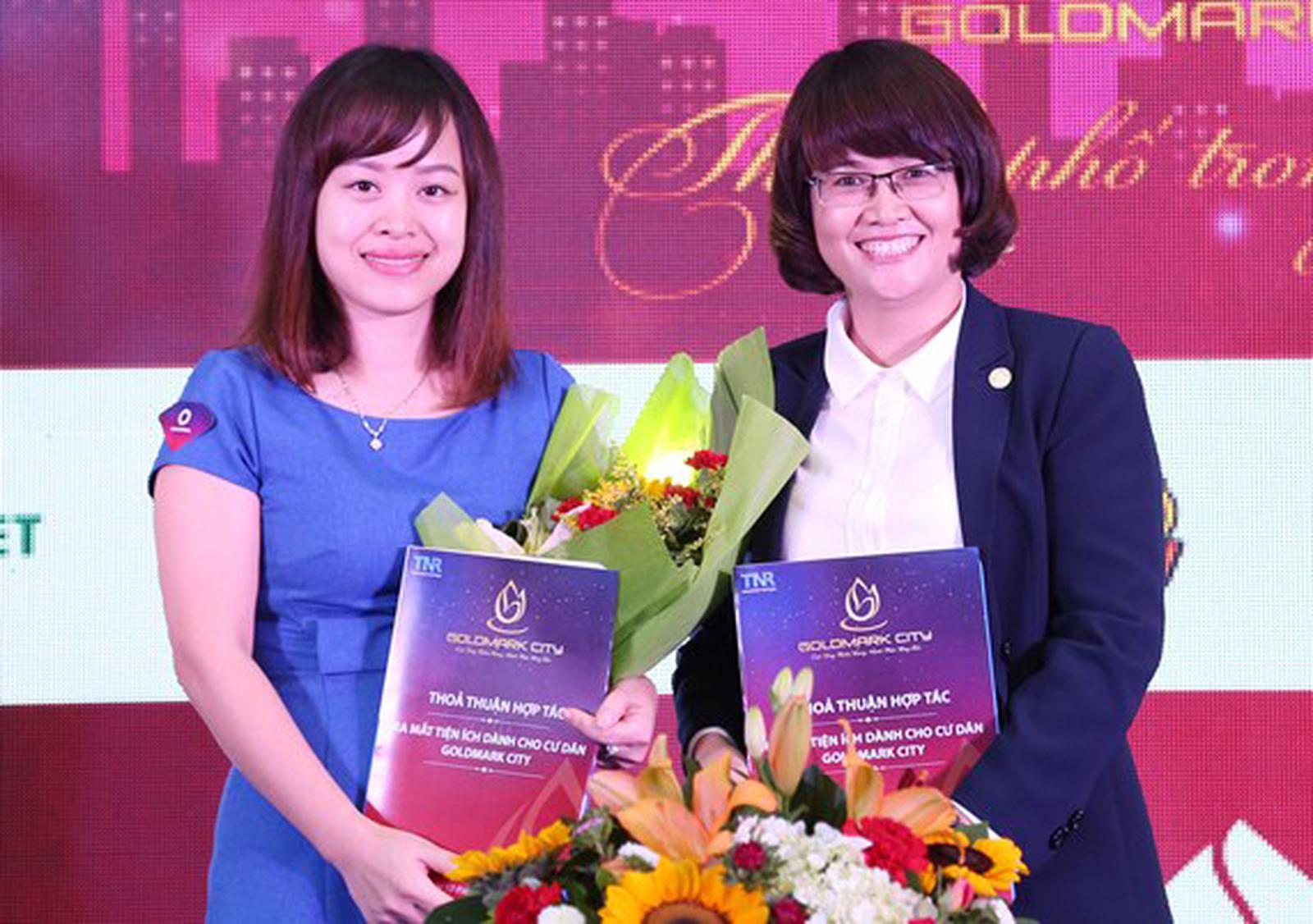 Bà Phạm Hồng Thúy – Giám đốc kinh doanh TNR Holdings Việt Nam ký kết hợp tác với bà Đỗ Lan Phương – Giám đốc Phòng giao dịch Ngân hàng BIDV tại GoldMark City.