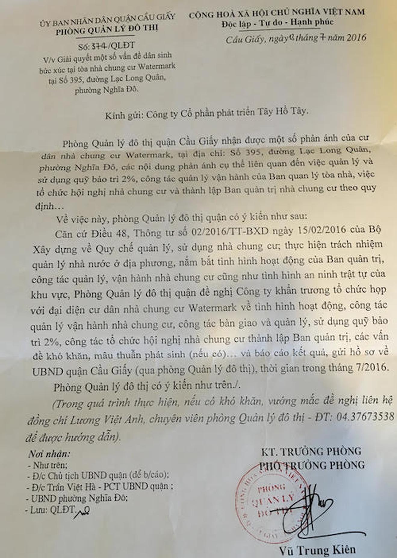 Vì vậy, Phòng quản lý đô thị quận Cầu Giấy có công văn đề nghị Công ty cổ phần phát triển Tây Hồ khẩn trương tổ chức họp với đại diện cư dân toà nhà về tình hình hoạt động, công tác quản lý vận hành nhà chung cư, công tác bàn giao và quản lý, sử dụng quỹ bảo trì 2%...và báo cáo kết quả, gửi hồ sơ về UBND quận Cầu Giấy, thời gian trong tháng 7/2016.