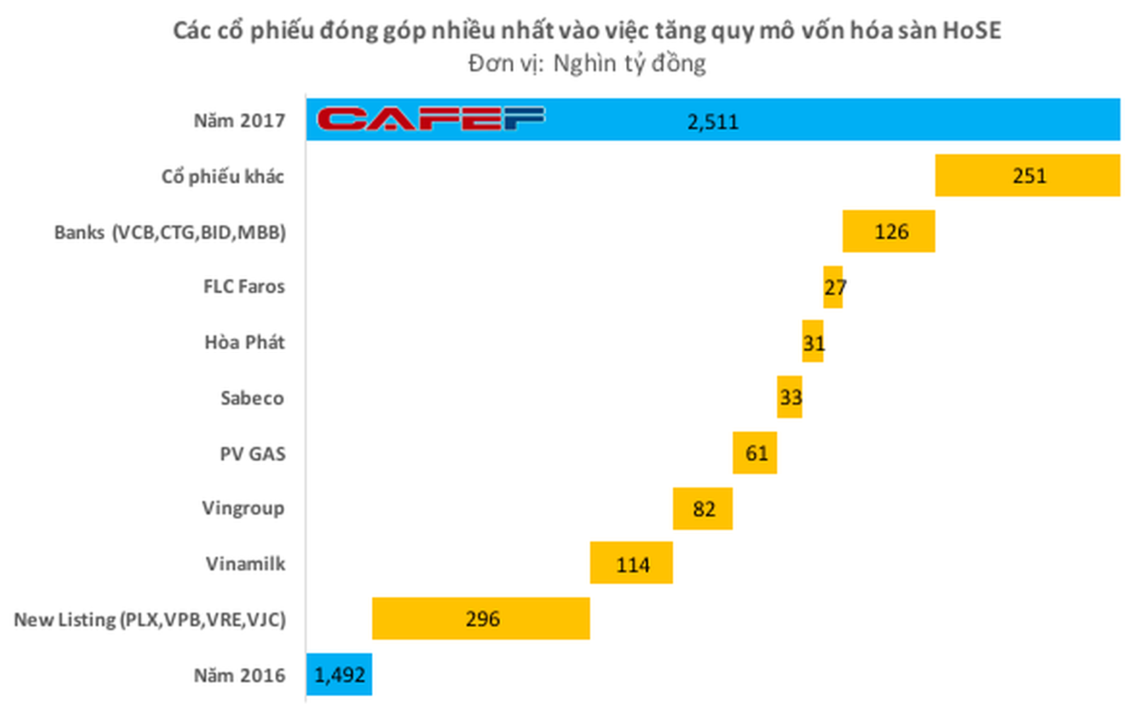 Cùng với sự góp mặt của những bom tấn mới mẻ, dòng tiền cũng đổ mạnh vào thị trường đẩy giá cổ phiếu tăng trưởng ấn tượng. Vì vậy, chỉ tính riêng sàn HOSE thì quy mô vốn hóa thị trường chứng khoán Việt Nam chỉ sau 1 năm đã tăng thêm hơn 1 triệu tỷ đồng. Tính đến ngày 21/12/2017, vốn hóa sàn này đạt hơn 2,5 triệu tỷ đồng, tương đương gần 110 tỷ USD.