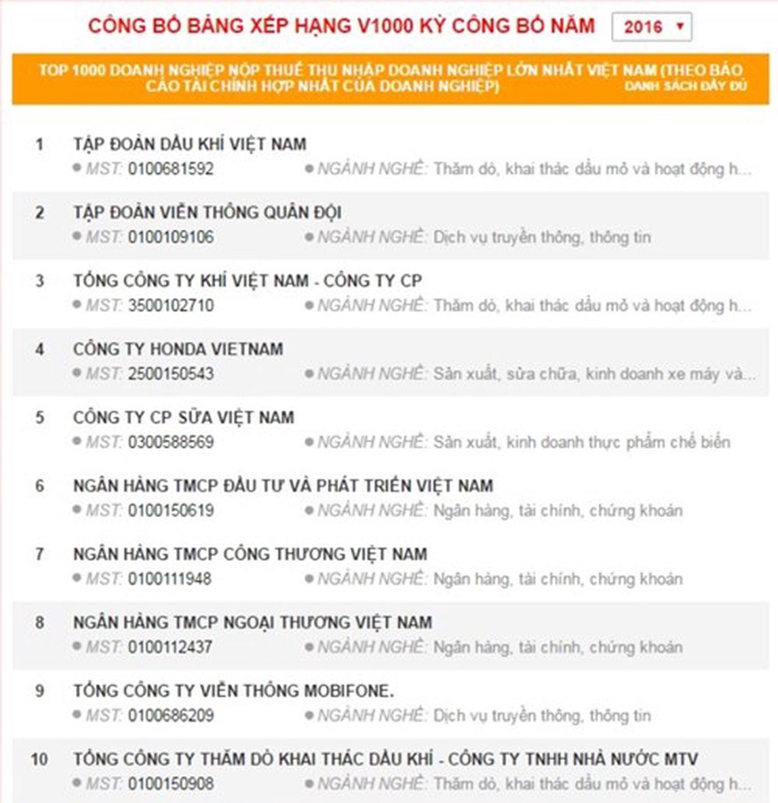 Bảng công bố V1000 của năm 2016, Công ty cổ phần Sữa Việt Nam(Vinamilk) là doanh nghiệp tư đầu tiên lọt vào top 5