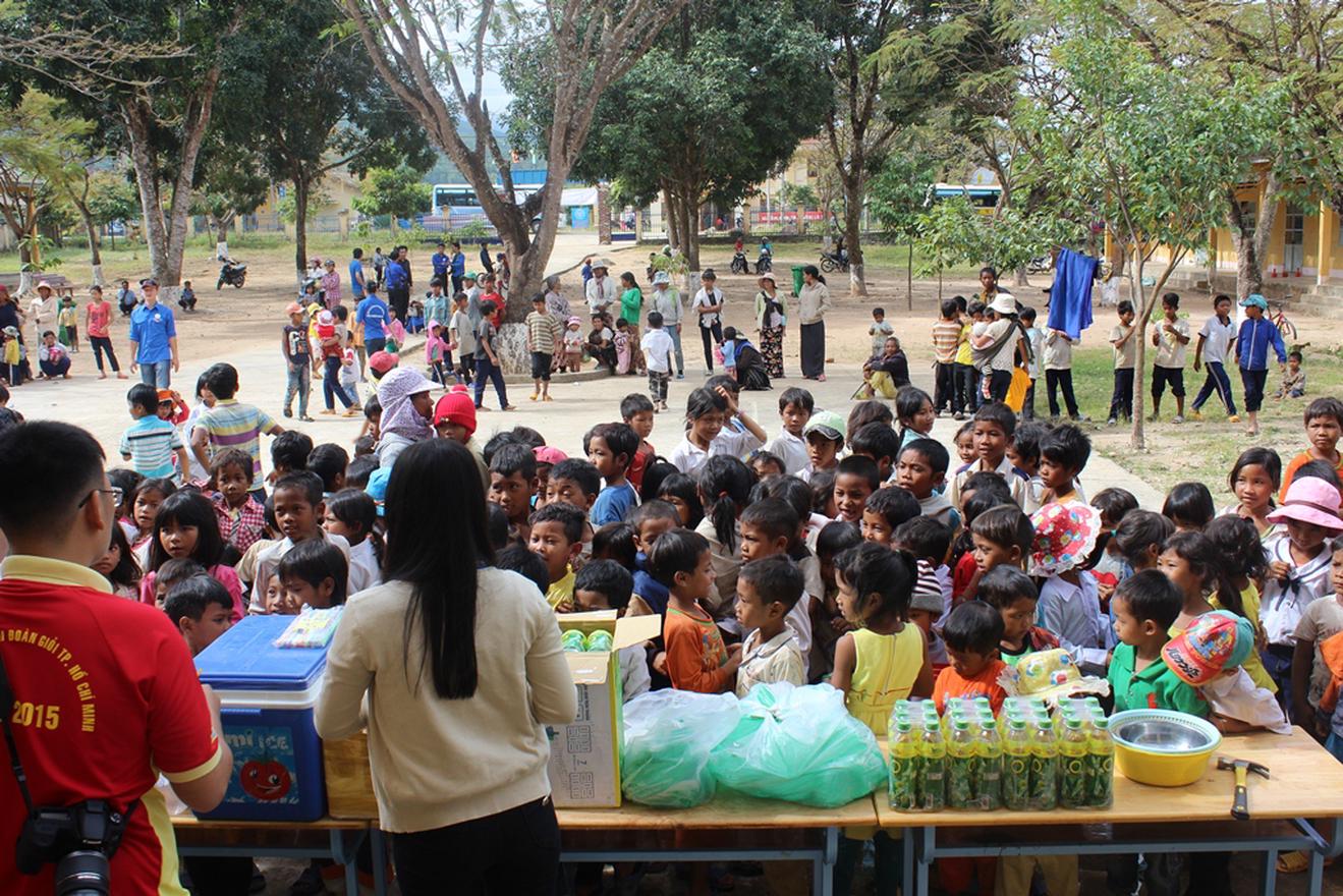 Các tình nguyện viên đưa nước cho các em nhỏ