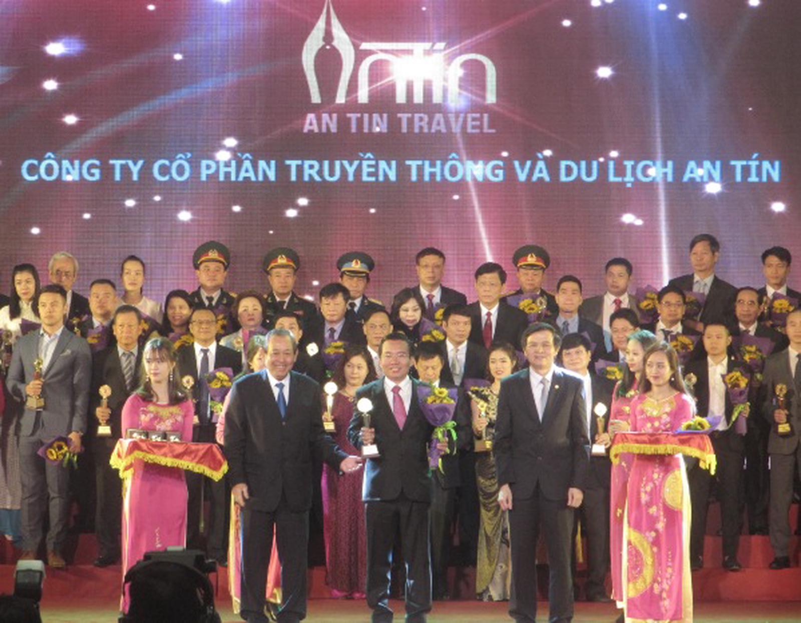 Phó Thủ tướng Thường trực Trương Hòa Bình, Phó Tổng Biên tập Tạp chí Cộng sản Đoàn Minh Huấn trao Cup và hoa cho đại diện Cty Cổ phần Truyền thông và Dịch vụ An Tín. Ảnh: TQ