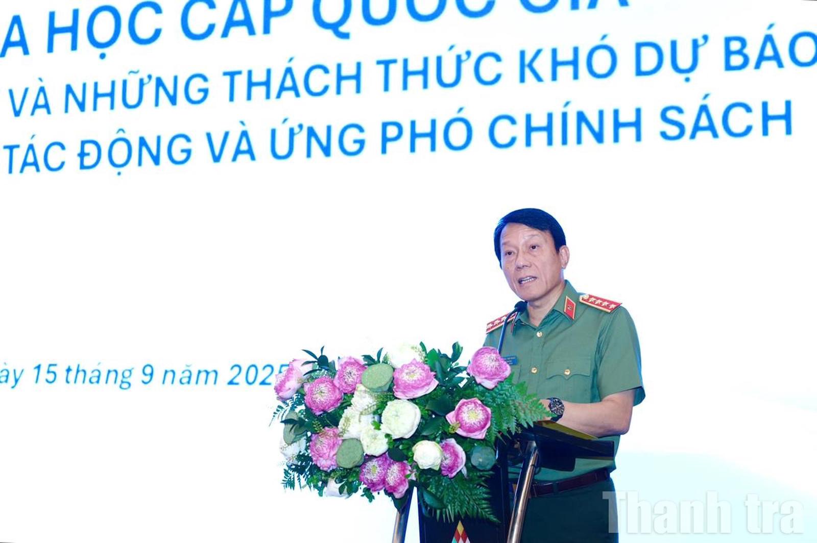 Đại tướng Lương Tam Quang nhấn mạnh, Hội thảo khoa học quốc gia “Sức mạnh không giới hạn và những thách thức khó dự báo của AI – Tác động và ứng phó chính sách” là bước thiết thực cụ thể hoá triển khai Nghị quyết số 57-NQ/TW của Bộ Chính trị, đóng góp tích cực vào sự nghiệp đổi mới sáng tạo, chuyển đổi số, phát triển đất nước phồn vinh, hạnh phúc và bảo đảm an ninh, trật tự.