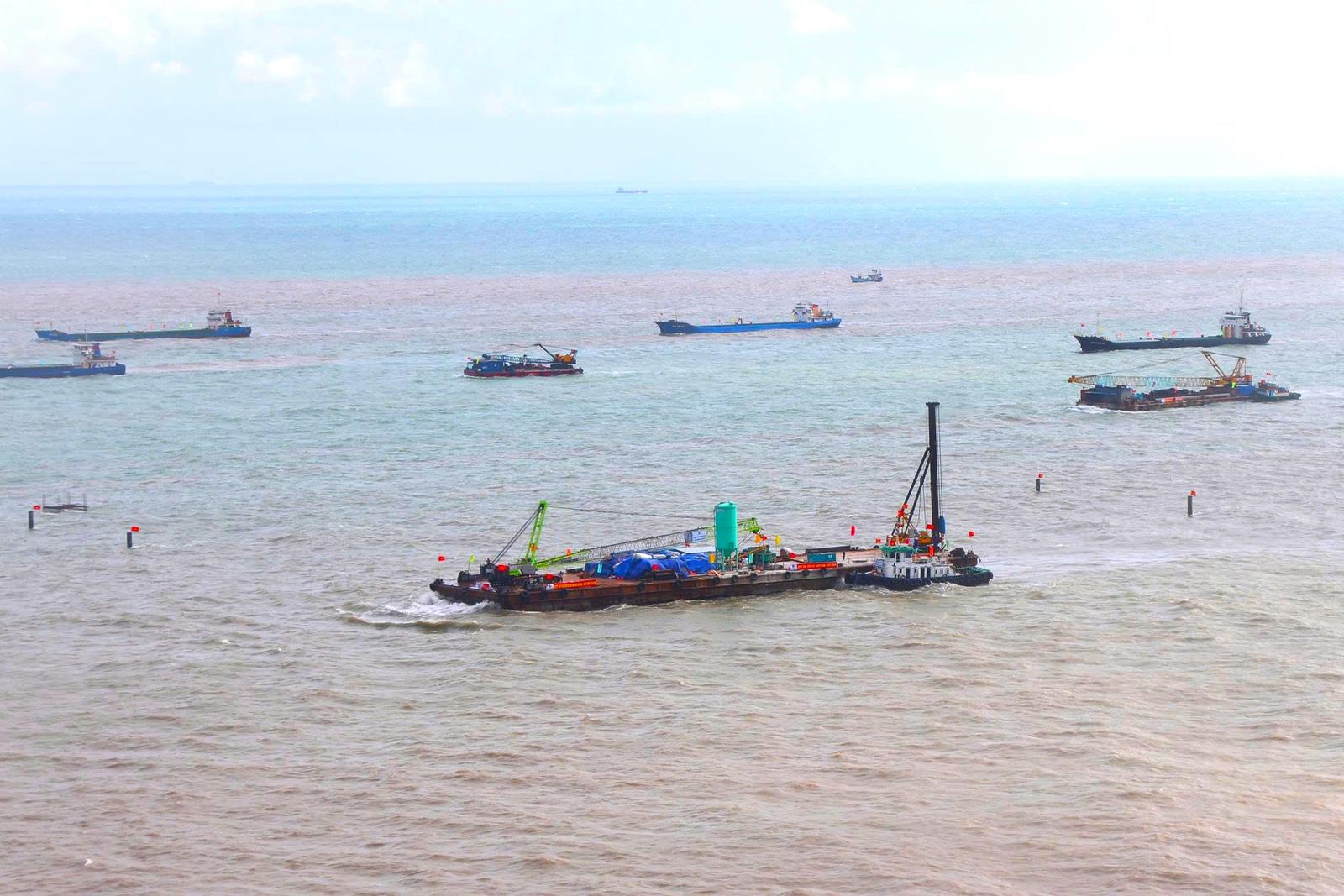 Công trường dự án cầu đường vượt biển hơn 18 km ra đảo Hòn Khoai đang khẩn trương thi công. Ảnh: A.X