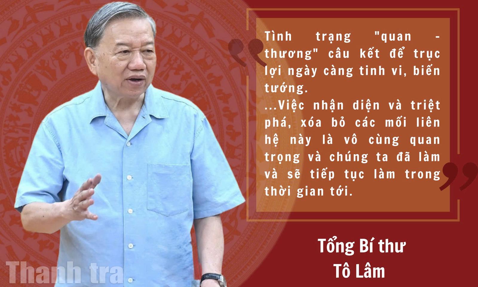 Tại cuộc họp Thường trực Ban Chỉ đạo Trung ương về phòng, chống tham nhũng, lãng phí, tiêu cực, Tổng Bí thư Tô Lâm đặc biệt lưu ý tình trạng “quan - thương” câu kết để trục lợi ngày càng tinh vi, biến tướng. Tổng Bí thư nhấn mạnh: Việc nhận diện, triệt phá và xóa bỏ mối quan hệ này là nhiệm vụ đặc biệt quan trọng.