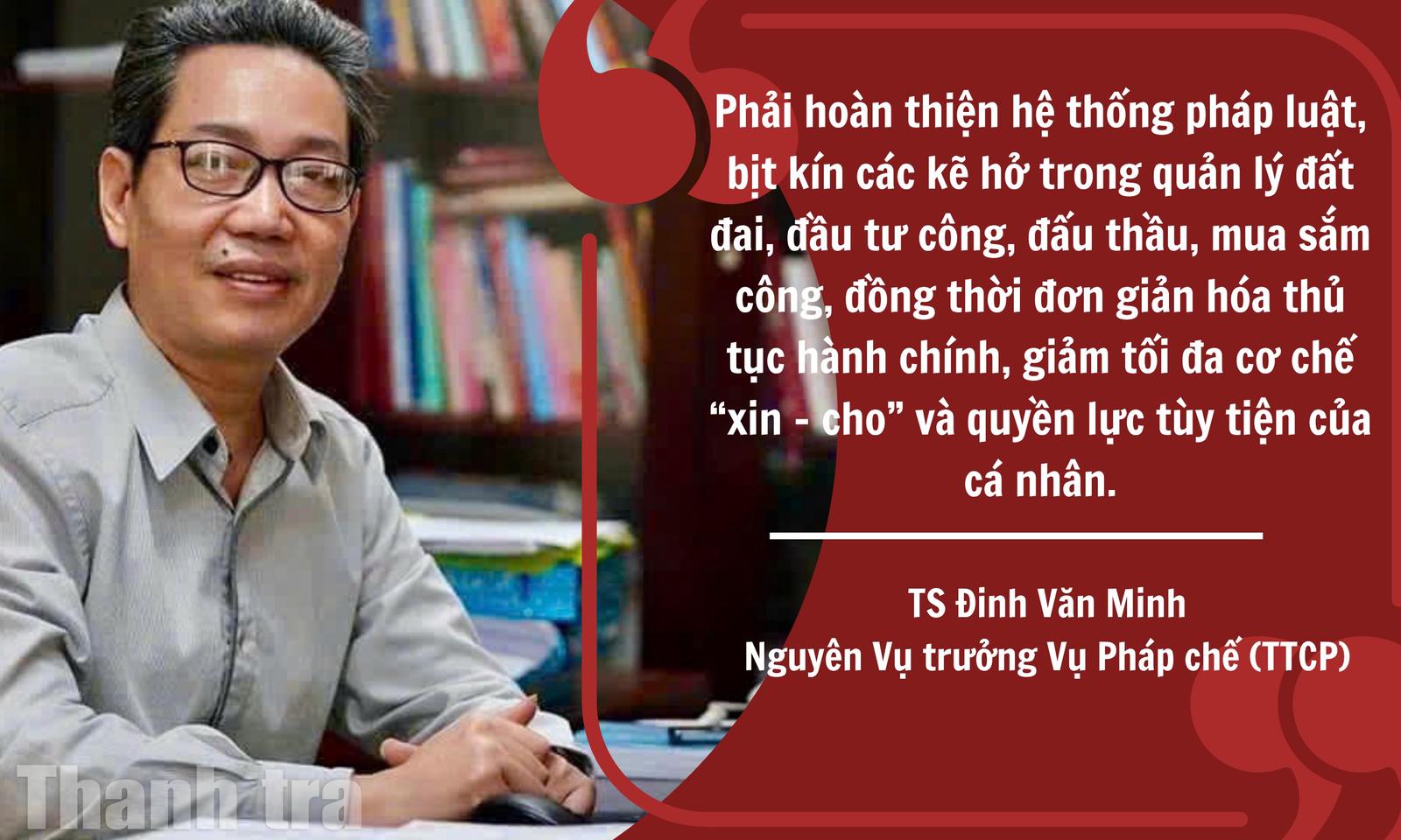 Theo TS Đinh Văn Minh, nguyên Vụ trưởng Vụ Pháp chế (Thanh tra Chính phủ), phải hoàn thiện hệ thống pháp luật, bịt kín các kẽ hở trong quản lý đất đai, đầu tư công, đấu thầu, mua sắm công, đồng thời đơn giản hóa thủ tục hành chính, giảm tối đa cơ chế “xin - cho” và quyền lực tùy tiện của cá nhân. Đồng thời, minh bạch hóa toàn bộ quy trình hành chính, hồ sơ đấu thầu, ngăn chặn tình trạng “thiết kế hồ sơ” cho doanh nghiệp sân sau.