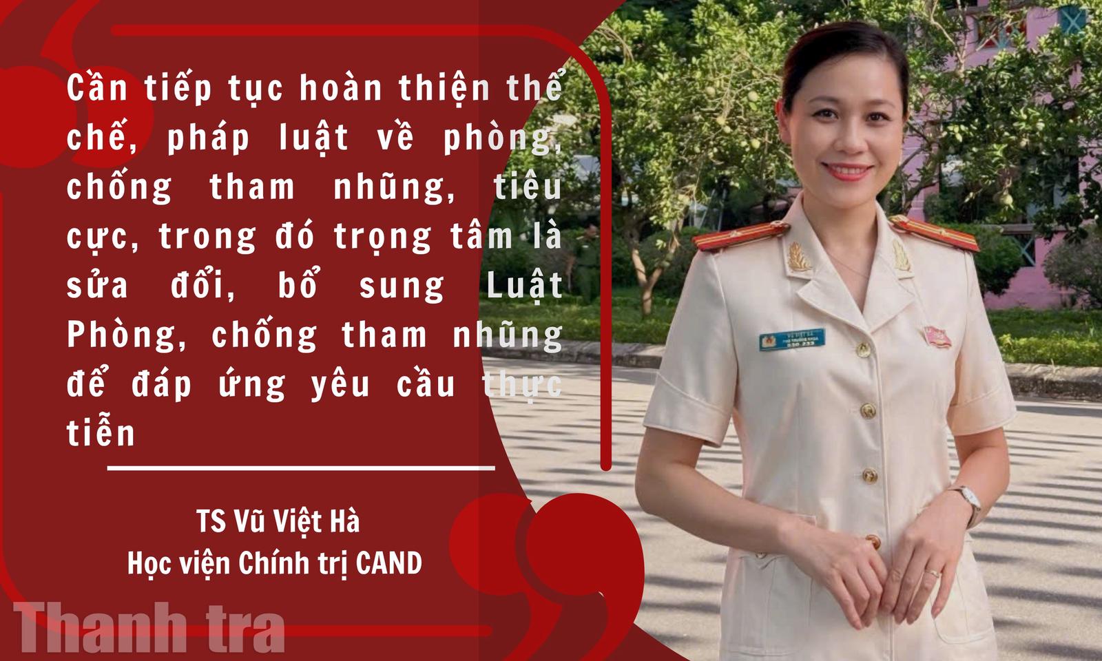 Bên cạnh đó, theo TS Vũ Việt Hà, một nhiệm vụ có ý nghĩa nền tảng là tiếp tục hoàn thiện thể chế, pháp luật về phòng, chống tham nhũng, tiêu cực, trong đó trọng tâm là sửa đổi, bổ sung Luật Phòng, chống tham nhũng để đáp ứng yêu cầu thực tiễn. Luật phải thật sự trở thành công cụ hữu hiệu trong việc kiểm soát quyền lực, phòng ngừa và xử lý tham nhũng, phù hợp với bối cảnh mới. Việc sửa đổi cần tập trung vào việc khắc phục những bất cập được bộc lộ trong quá trình thực thi, bổ sung quy định rõ ràng hơn về trách nhiệm, minh bạch, kê khai tài sản, thu nhập, đồng thời tăng cường cơ chế giám sát độc lập.