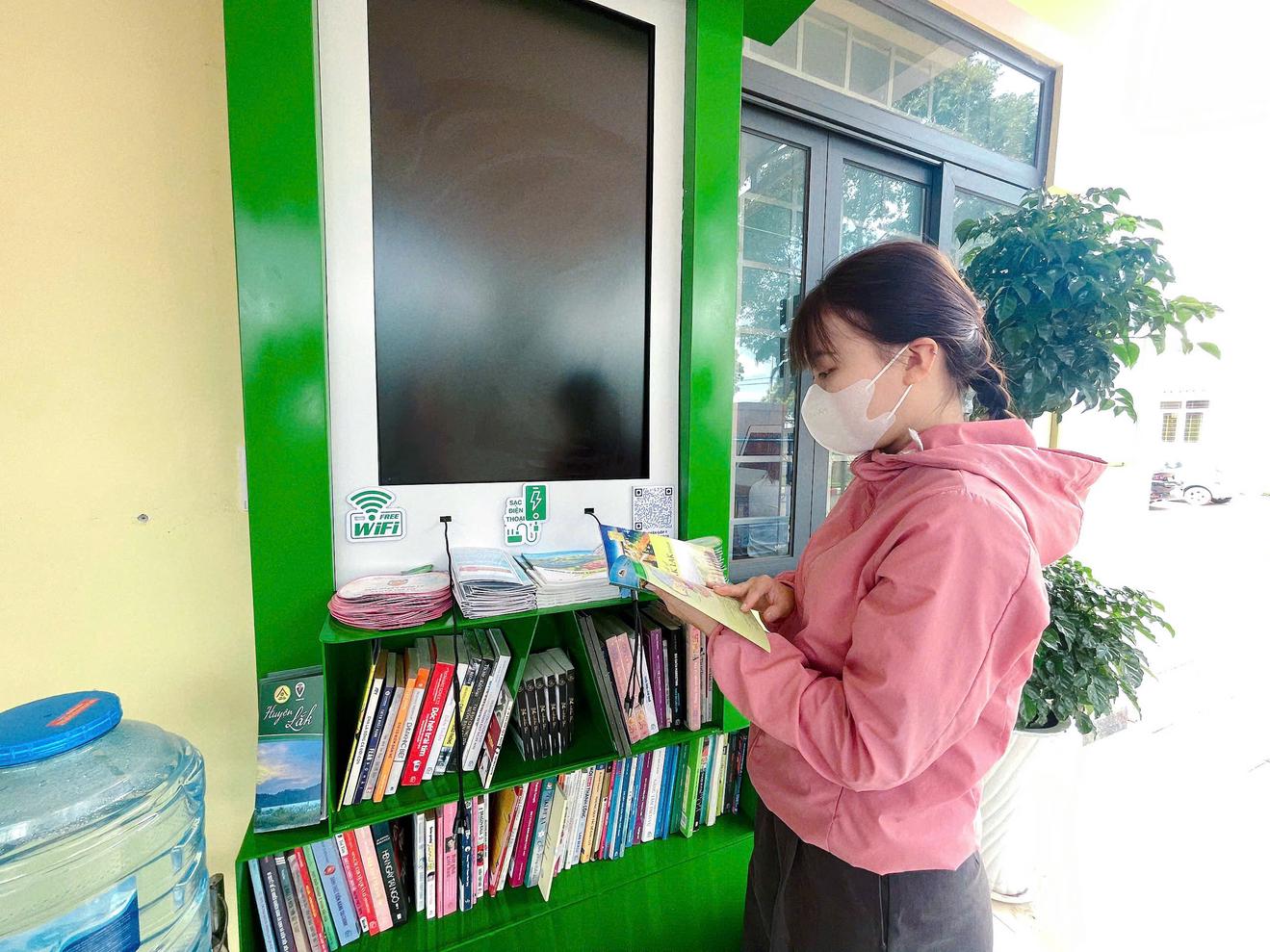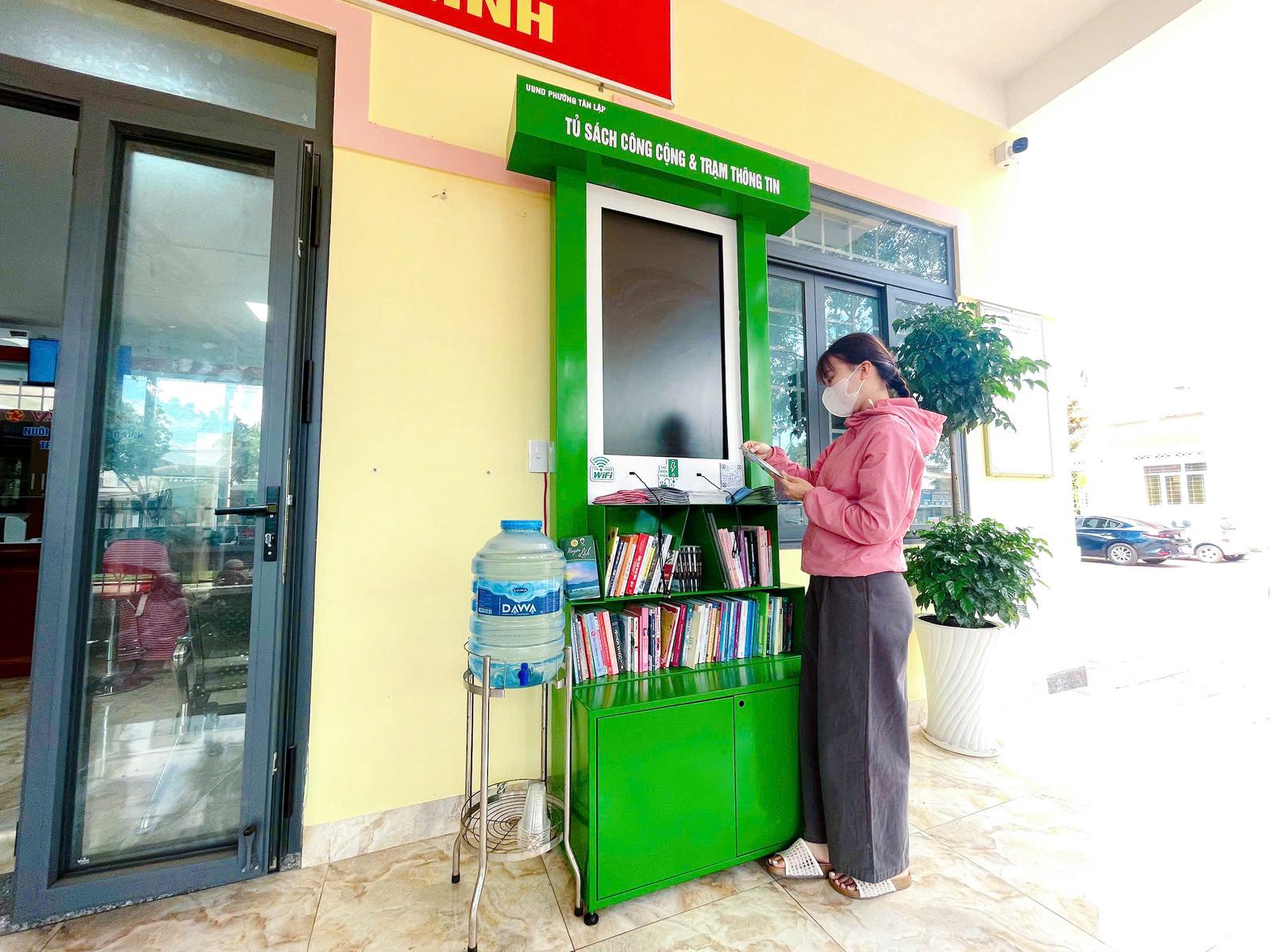 Chị Phạm Thị Thanh trải nghiệm không gian "Tủ sách cộng đồng và Trạm thông tin thông minh" tại UBND phường Tân Lập, tỉnh Đắk Lắk. Ảnh: TL