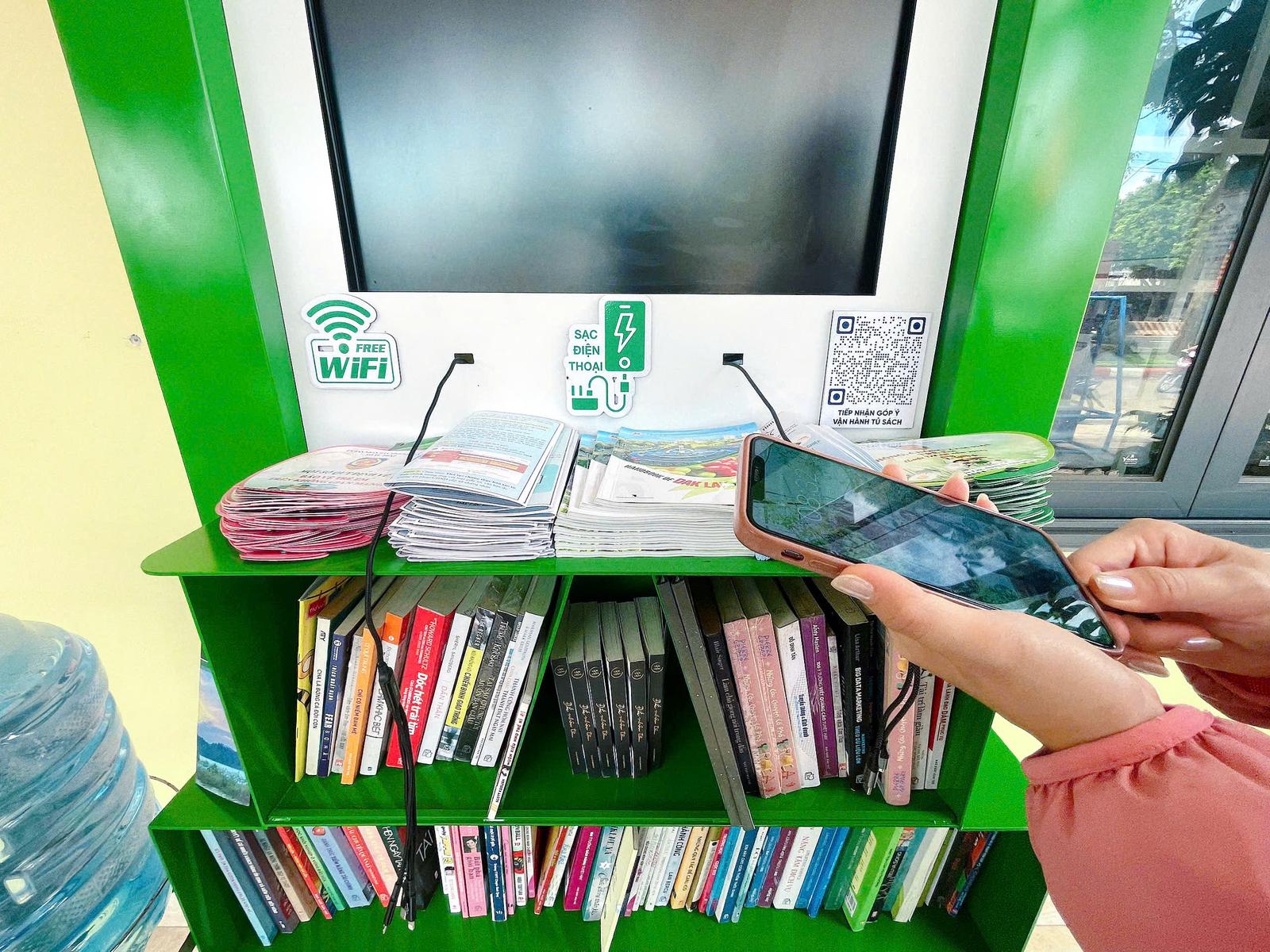 Song song đó, trạm thông tin thông minh được trang bị các tiện ích thiết thực như Wi-Fi miễn phí, trạm sạc điện thoại công cộng, màn hình phát video hướng dẫn các thủ tục hành chính, tờ gấp và mã QR kết nối với các ứng dụng hữu ích như Đắk Lắk Số, VNeID...