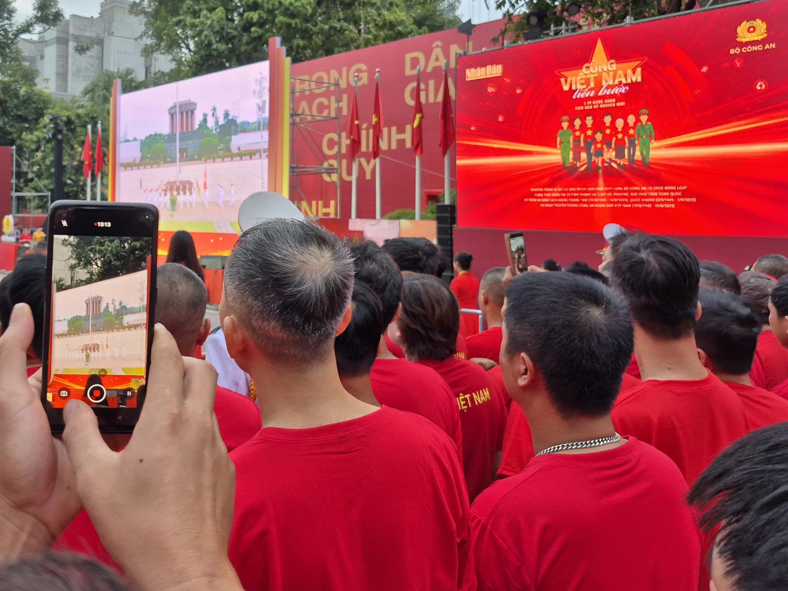 Người tham gia cùng hướng về quảng trường Ba Đình theo dõi lễ thượng cờ Tổ quốc. Ảnh: Trần Huy