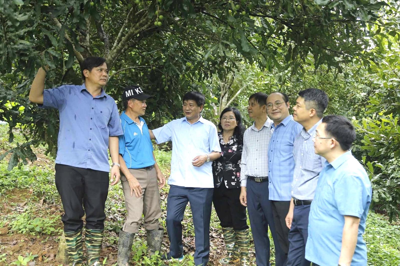 Ông Lê Xuân Cảnh (đeo kính, thứ 3 từ phải qua) cùng Chủ tịch UBND tỉnh Điện Biên Lê Thành Đô và nhiều lãnh đạo UBND tỉnh thăm vườn mác ca tại xã Tuần Giáo. Ảnh: Vinh Duy