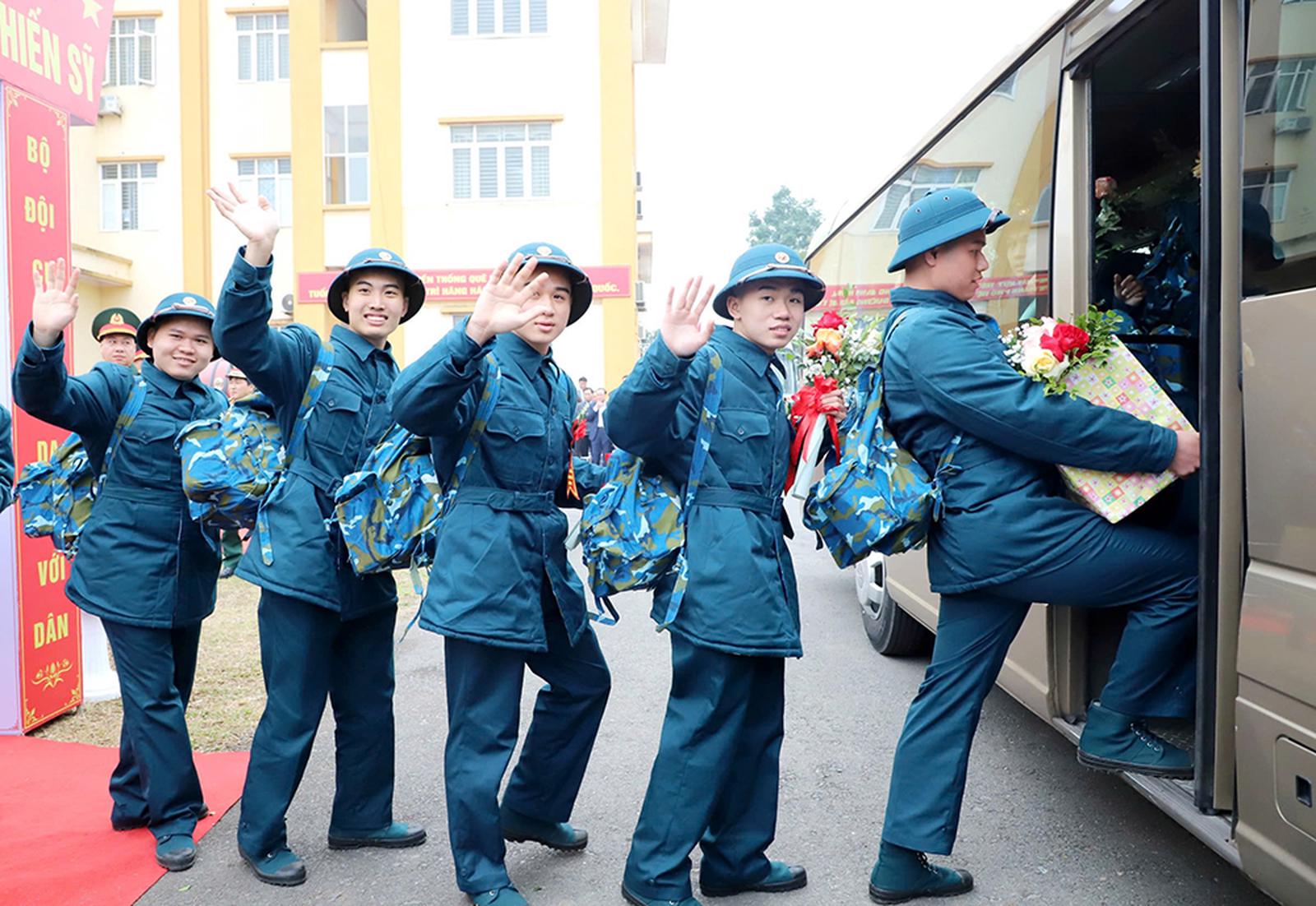 Các chiến sỹ tân binh náo nức chào tạm biệt người thân để sẵn sàng lên đường. Ảnh: ND