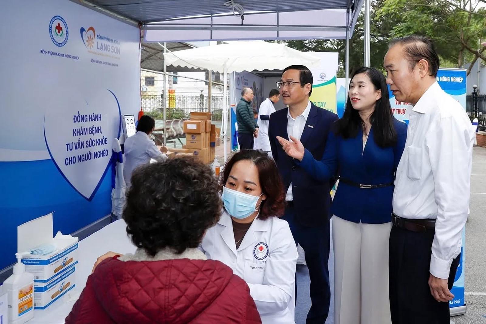 Thứ trưởng Phùng Đức Tiến (ngoài cùng bên phải) và Phó Chủ tịch UBND tỉnh Lạng Sơn Trần Thanh Nhàn tham quan gian hàng khám chữa bệnh miễn phí cho người nghèo.