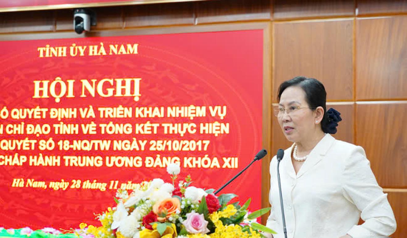 Bà Lê Thị Thủy, Bí thư Tỉnh ủy Hà Nam phát biểu chỉ đạo tại hội nghị thành lập Ban Chỉ đạo tỉnh về tổng kết thực hiện Nghị quyết 18-NQ/TW. Ảnh: Hoa Hiền