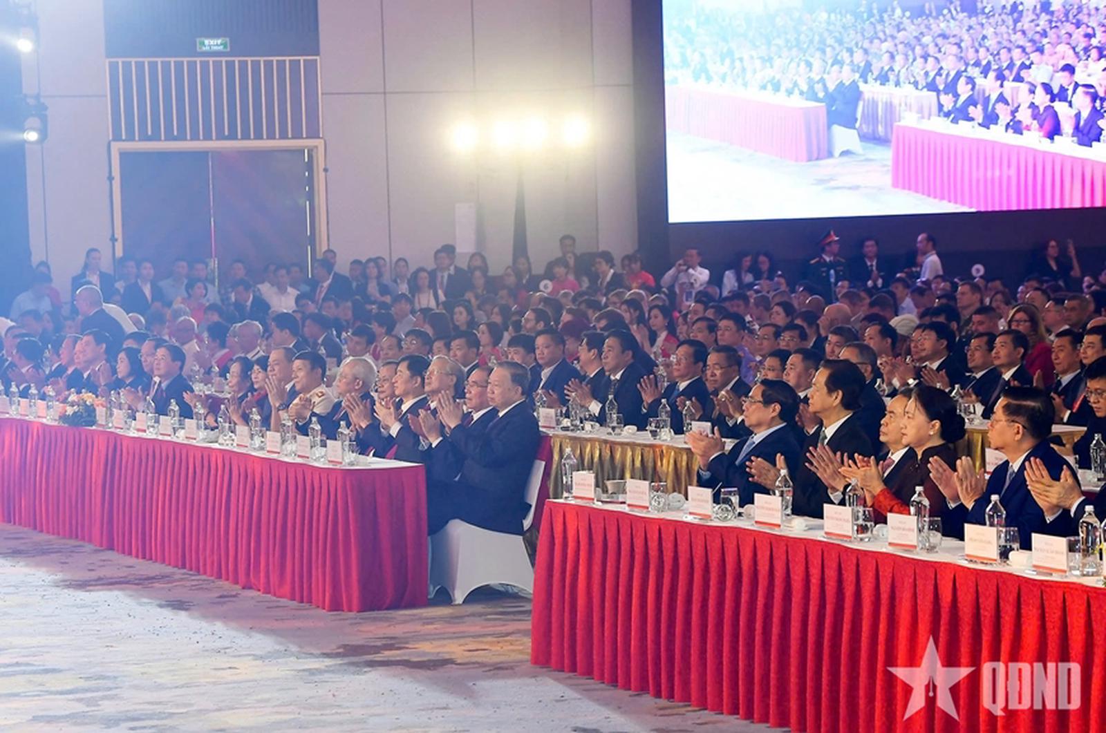 Tổng Bí thư Tô Lâm, Thủ tướng Chính phủ Phạm Minh Chính, Chủ tịch Quốc hội Trần Thanh Mẫn cùng các đại biểu đến dự khai mạc Triển lãm “80 năm Hành trình Độc lập - Tự do - Hạnh phúc” - Ảnh: VGP/Nhật Bắc