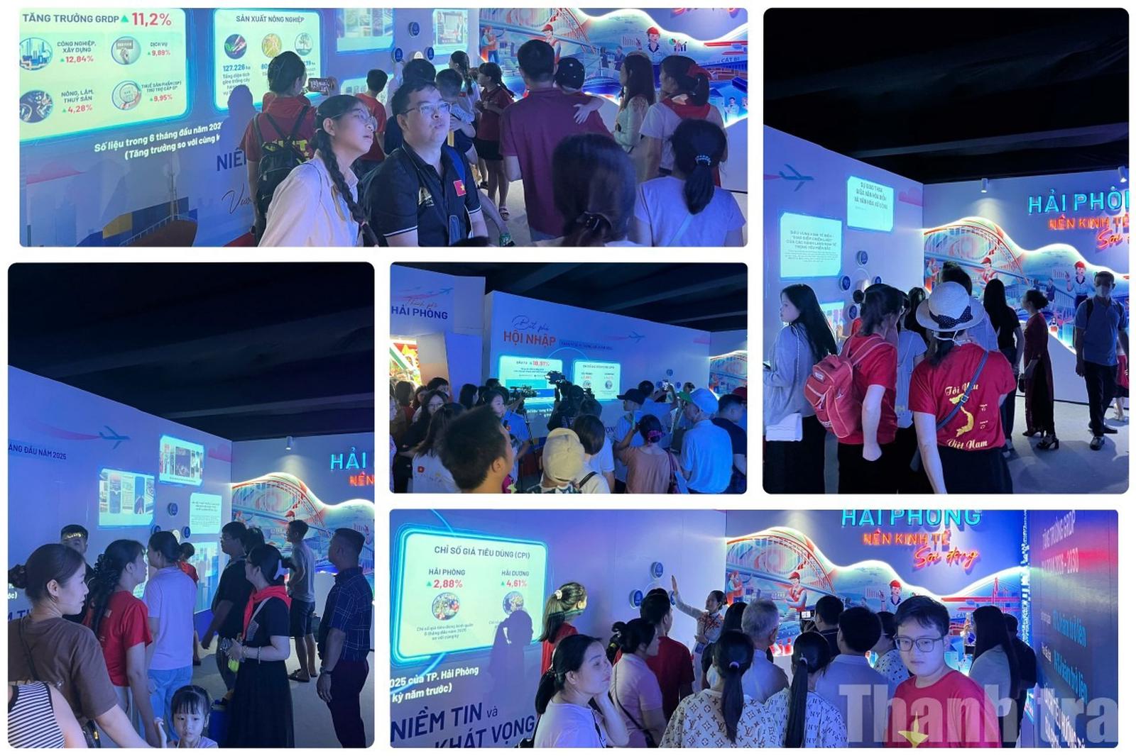 Không gian trưng bày trong nhà thể hiện 11 nhóm chuyên đề chính, bao gồm những thành tựu về kinh tế, văn hóa, xã hội, đối ngoại, quốc phòng, an ninh qua các giai đoạn lịch sử. Hệ thống màn hình cảm ứng tương tác cùng hơn 400 hình ảnh và tư liệu quý được chọn lọc kỹ lưỡng, giúp người xem hiểu rõ hơn về nền tảng vững chắc để thành phố tiếp tục bứt phá. Tất cả đã tạo nên một bức tranh toàn cảnh về một Hải Phòng năng động, hiện đại và tràn đầy sức sống.