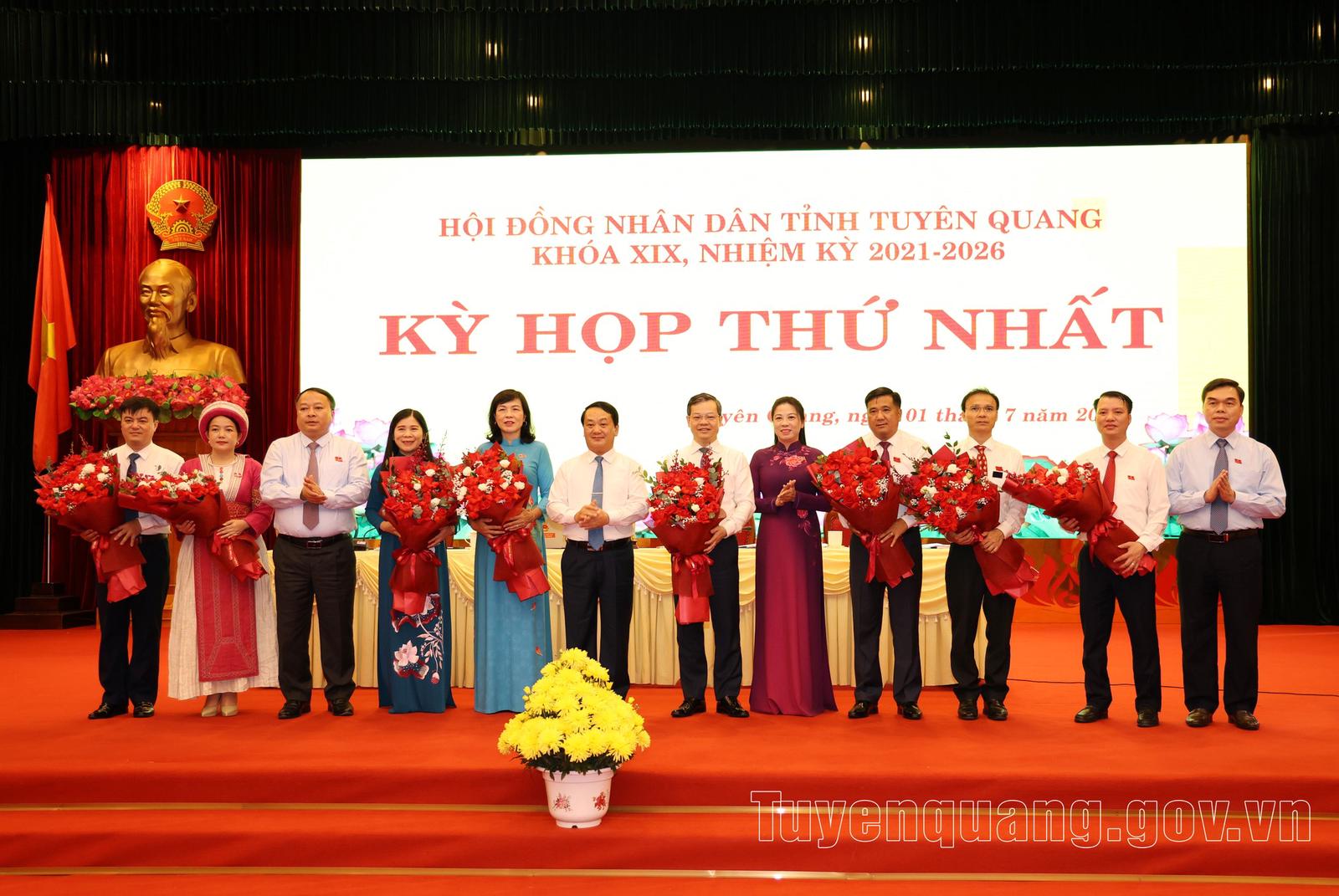 Thường trực Tỉnh ủy Tuyên Quang tặng hoa chúc mừng tân Chủ tịch HĐND tỉnh Nguyễn Văn Sơn và các đồng chí Thường trực HĐND tỉnh khóa XIX