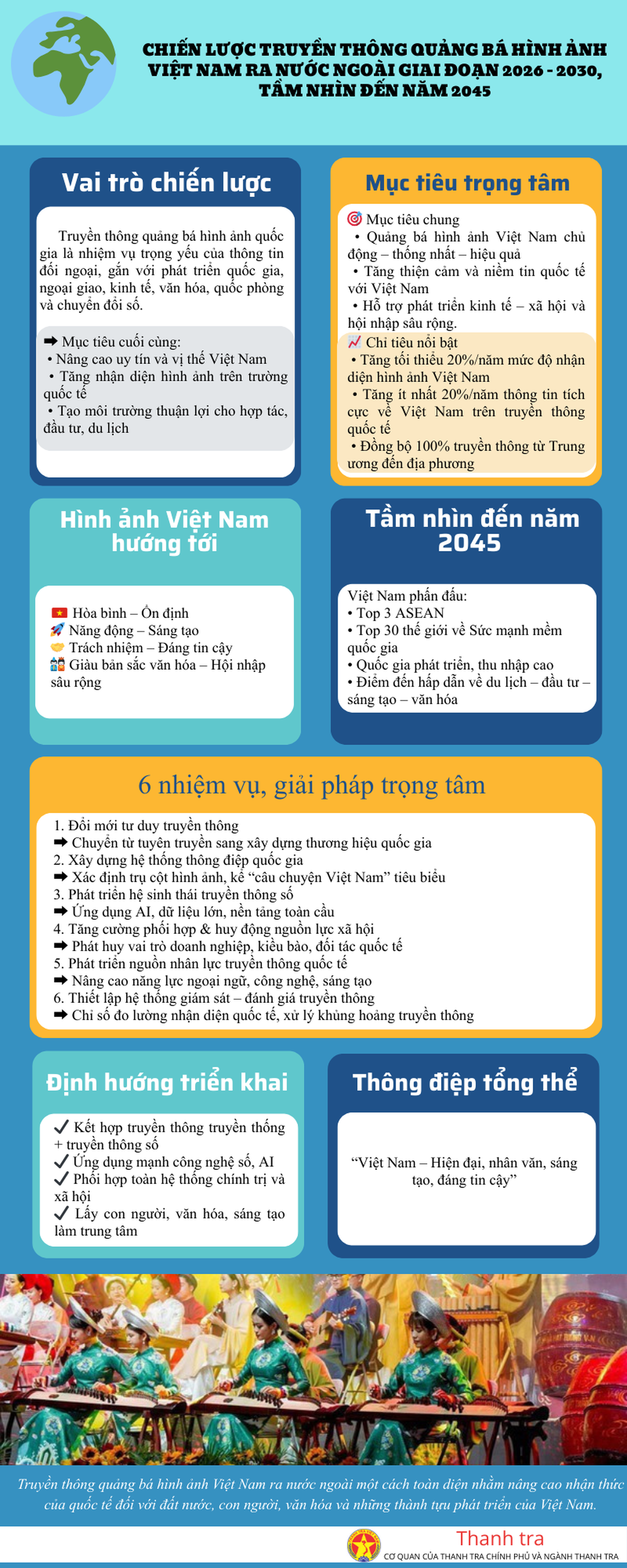 (Thanh tra) - Trong bối cảnh hội nhập quốc tế sâu rộng, Việt Nam triển khai chiến lược truyền thông quốc gia giai đoạn 2026–2030, tầm nhìn 2045 nhằm nâng cao uy tín, vị thế và sức cạnh tranh quốc gia, đồng thời lan tỏa hình ảnh đất nước hòa bình, sáng tạo, giàu bản sắc tới cộng đồng quốc tế.