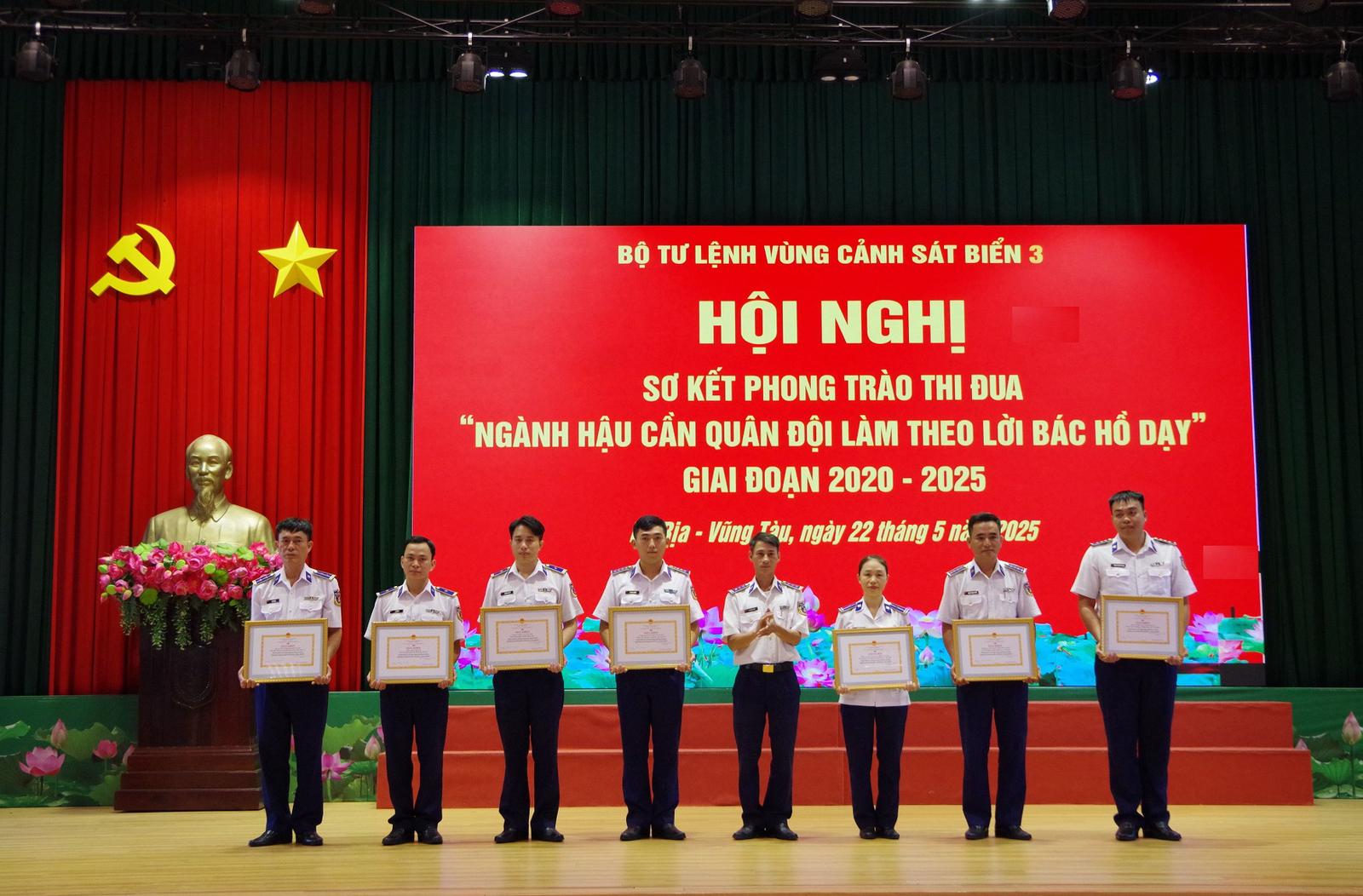 Nhân dịp này, Bộ Tư lệnh Vùng Cảnh sát biển 3 đã trao Giấy khen cho 6 tập thể và 13 cá nhân có thành tích xuất sắc trong thực hiện phong trào thi đua “Ngành Hậu cần Quân đội làm theo lời Bác Hồ dạy” giai đoạn 2020–2025, nhằm biểu dương, lan tỏa điển hình, tạo động lực thi đua cho giai đoạn tiếp theo.
