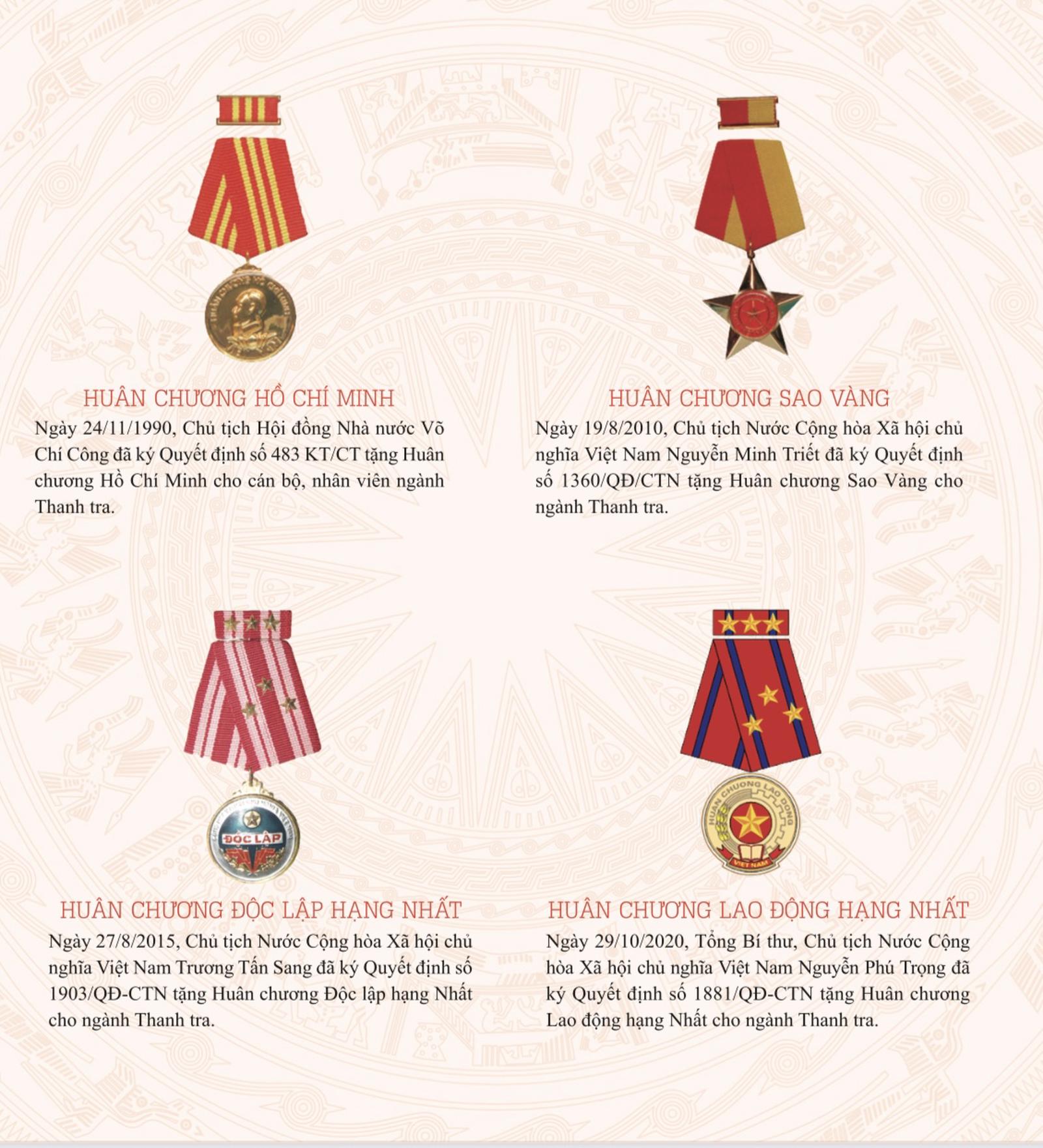Đóng góp to lớn của ngành Thanh tra đã được Đảng, Nhà nước ghi nhận và trao tặng nhiều phần thưởng cao quý như: Huân chương Hồ Chí Minh (1990); Huân chương Sao vàng (2010); Huân chương Độc lập hạng Nhất (2015); Huân chương Lao động hạng Nhất (2020). Nhiều thế hệ lãnh đạo, cán bộ tiêu biểu như các bậc tiền bối Bùi Bằng Đoàn, Trần Đăng Ninh, Hồ Tùng Mậu, Nguyễn Lương Bằng… đã để lại tấm gương sáng về sự trung thành, liêm chính, tận tụy. Truyền thống vẻ vang đó chính là nền tảng để ngành Thanh tra hôm nay tiếp tục khẳng định vị trí, sứ mệnh trong sự nghiệp xây dựng và phát triển đất nước.