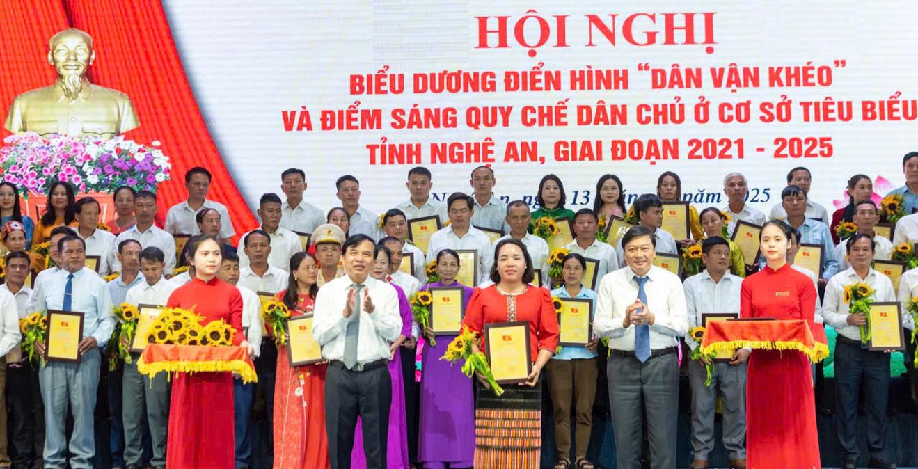 Nhằm ghi nhận, tôn vinh những đóng góp xuất sắc, Ban Chỉ đạo phong trào thi đua dân vận khéo tỉnh Nghệ An đã trao Giấy chứng nhận cho 45 tập thể và 34 cá nhân là điển hình dân vận khéo tiêu biểu giai đoạn 2021–2025; Ban Chỉ đạo quy chế dân chủ ở cơ sở tỉnh trao Giấy chứng nhận cho 52 tập thể và 21 cá nhân là “điểm sáng quy chế dân chủ ở cơ sở”. Ngoài ra, UBND tỉnh Nghệ An cũng tặng Bằng khen cho 20 tập thể, cá nhân điển hình trong phong trào thi đua “Dân vận khéo” và thực hiện quy chế dân chủ ở cơ sở giai đoạn này.