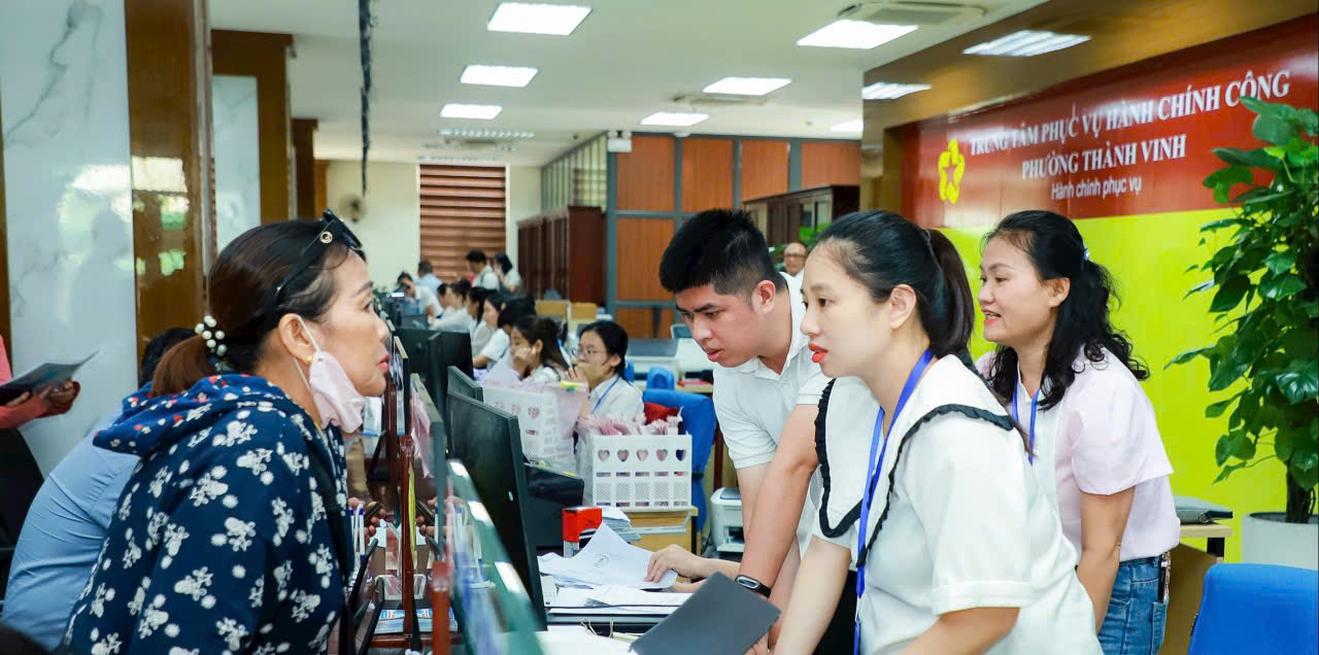 Cán bộ Trung tâm phục vụ hành chính công ở Nghệ An giải quyết thủ tục hành chính cho Nhân dân. Ảnh: Thành Duy
