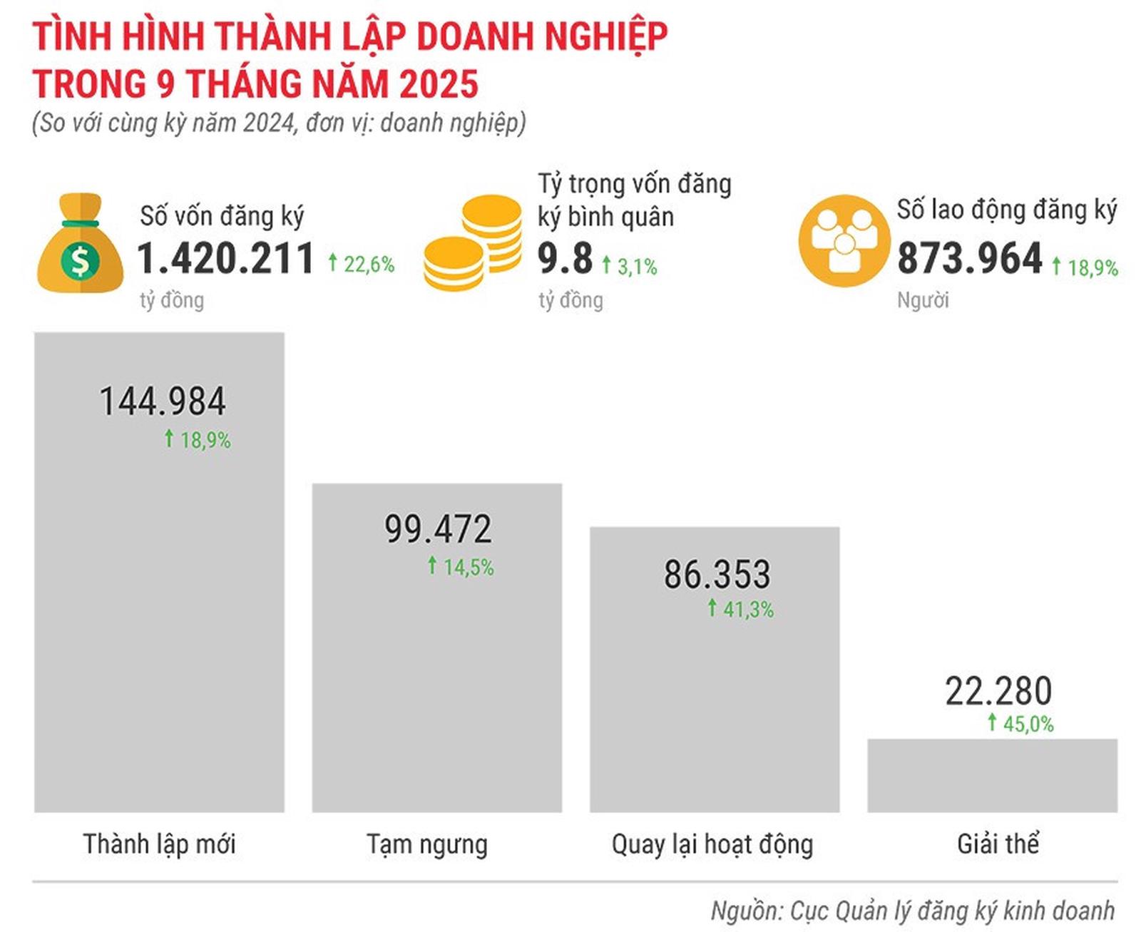 Số liệu thống kê từ Cục Thống kê cho thấy một bức tranh đầy tích cực. Trong 9 tháng năm 2025, cả nước có tổng cộng 231.337 doanh nghiệp gia nhập và tái gia nhập thị trường, tăng 26,4% so với cùng kỳ năm 2024. Con số ấn tượng này cao gấp 1,3 lần số doanh nghiệp rút lui khỏi thị trường trong cùng kỳ.