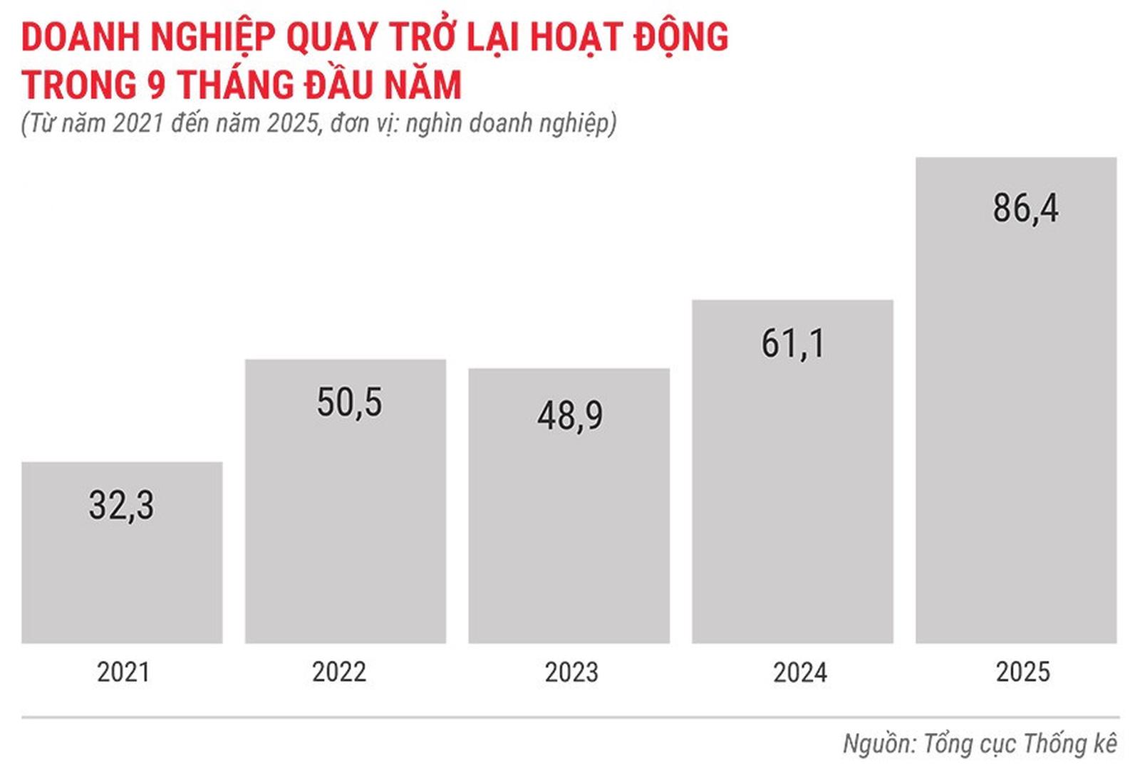 Bên cạnh làn sóng khởi nghiệp, niềm tin kinh doanh được củng cố còn thể hiện qua số lượng doanh nghiệp quay trở lại hoạt động. 9 tháng đầu năm ghi nhận 83.353 doanh nghiệp quay trở lại, tăng 41,3% so với cùng kỳ 2024. Đây là minh chứng rõ ràng cho thấy các chính sách hỗ trợ của Chính phủ, với tinh thần chủ đạo từ Nghị quyết 68, đã giúp doanh nghiệp tìm thấy cơ hội mới và sự lạc quan để tái khởi động hoạt động kinh doanh.