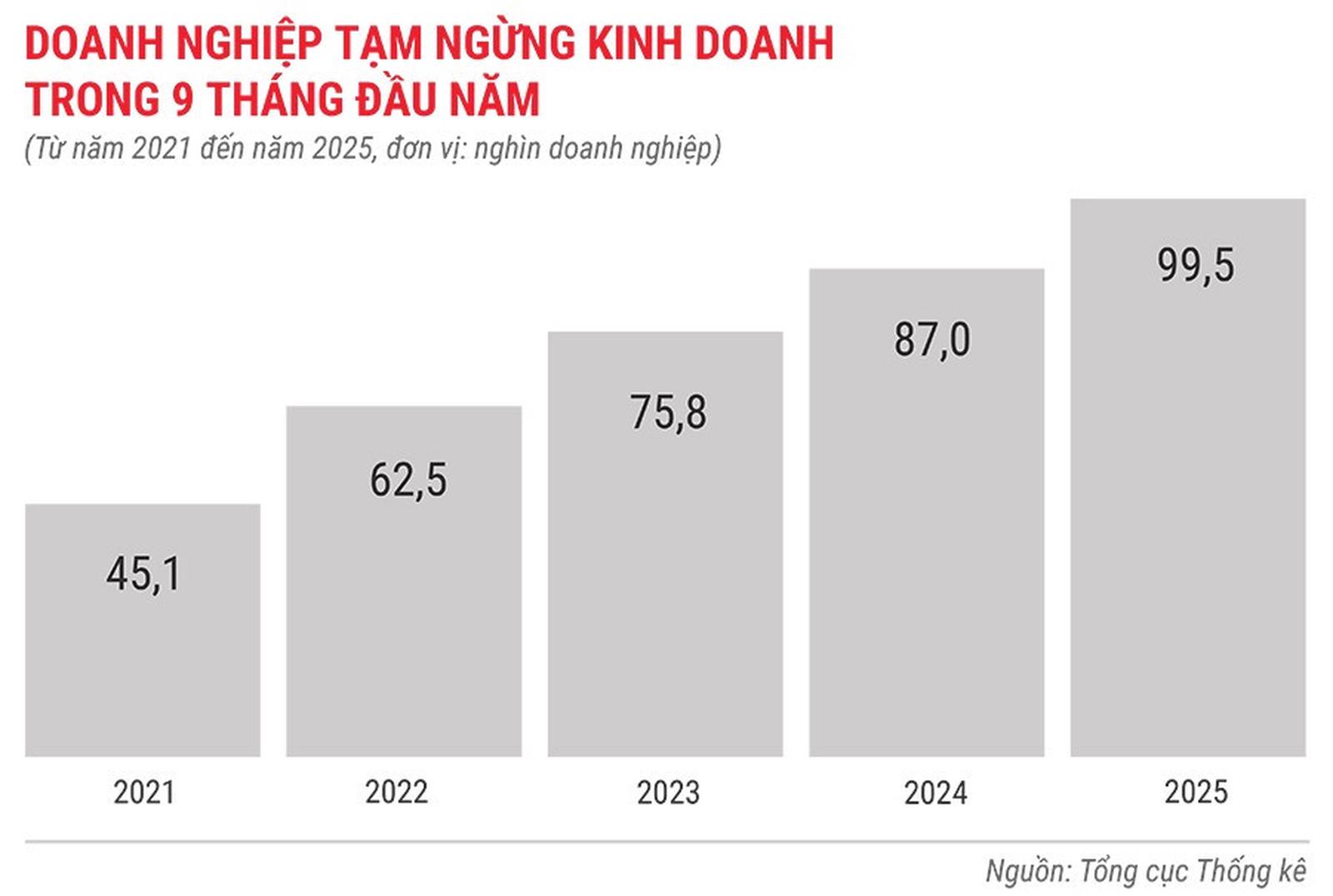 Tốc độ tăng số doanh nghiệp rút lui khỏi thị trường (6,8%) tuy đã chững lại và ở mức thấp nhất trong nhiều năm, nhưng phân tích sâu hơn cho thấy nhiều vấn đề. Phần lớn (56,9%) doanh nghiệp rút lui là chọn hình thức tạm ngừng kinh doanh có thời hạn. Điều này cho thấy doanh nghiệp không hẳn "chết" mà chỉ tạm "đóng băng" hoạt động để tái cơ cấu, tìm kiếm cơ hội mới, hoặc chờ đợi điều kiện thuận lợi hơn.