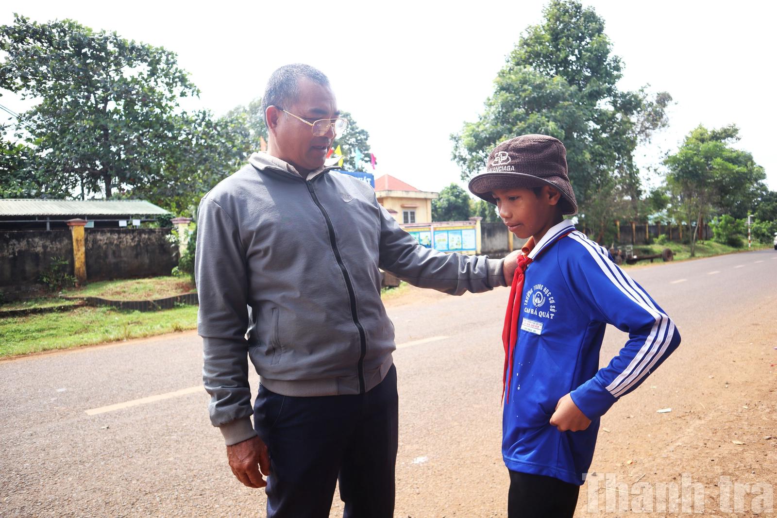 Người uy tín Y Suinh Byă ở buôn Trăp, xã Cư M’gar (Đắk Lắk) động viên em học sinh nỗ lực học tập, duy trì con đường đến trường. Ảnh: NG