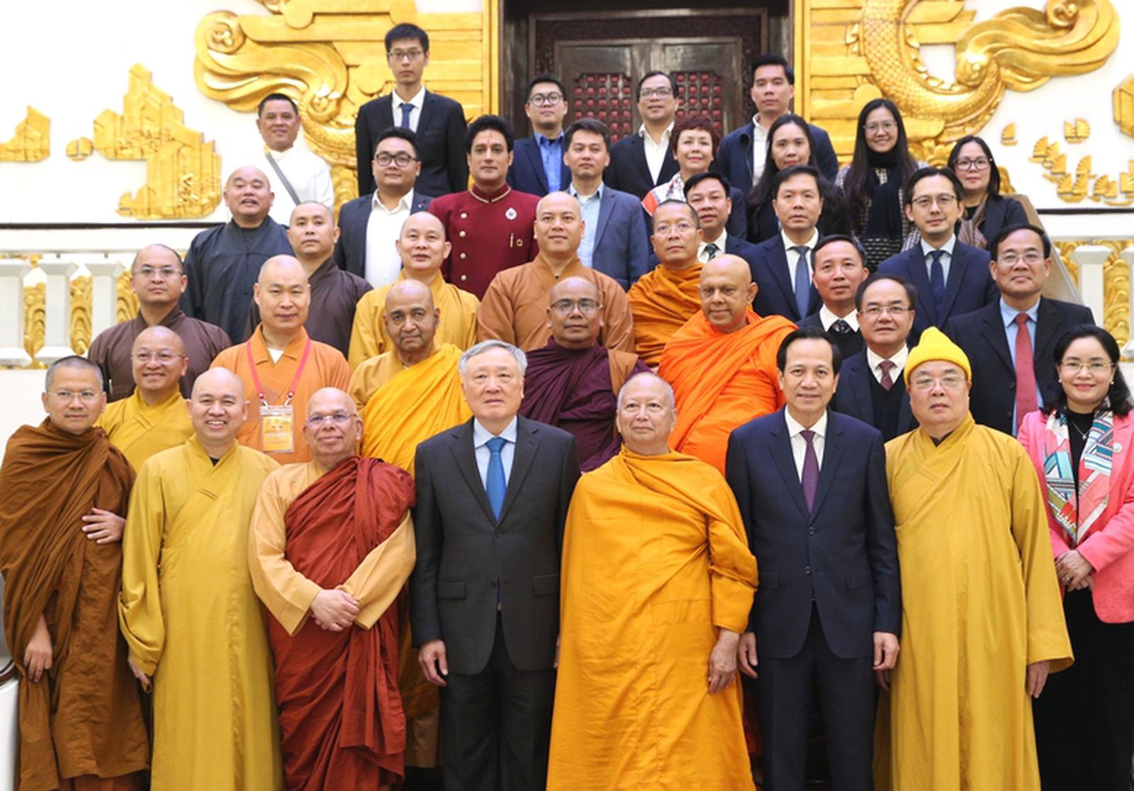 Phó Thủ tướng Nguyễn Hòa Bình, và Bộ trưởng Dân tộc và Tôn giáo Đào Ngọc Dung chụp ảnh lưu niệm cùng Đoàn Ủy ban Tổ chức quốc tế Đại lễ Vesak LHQ (ICDV) do Hòa thượng, GS.TS. Phra Brahmapundit, Chủ tịch ICDV dẫn đầu thăm và làm việc tại Việt Nam vừa qua (Ảnh: VGP).