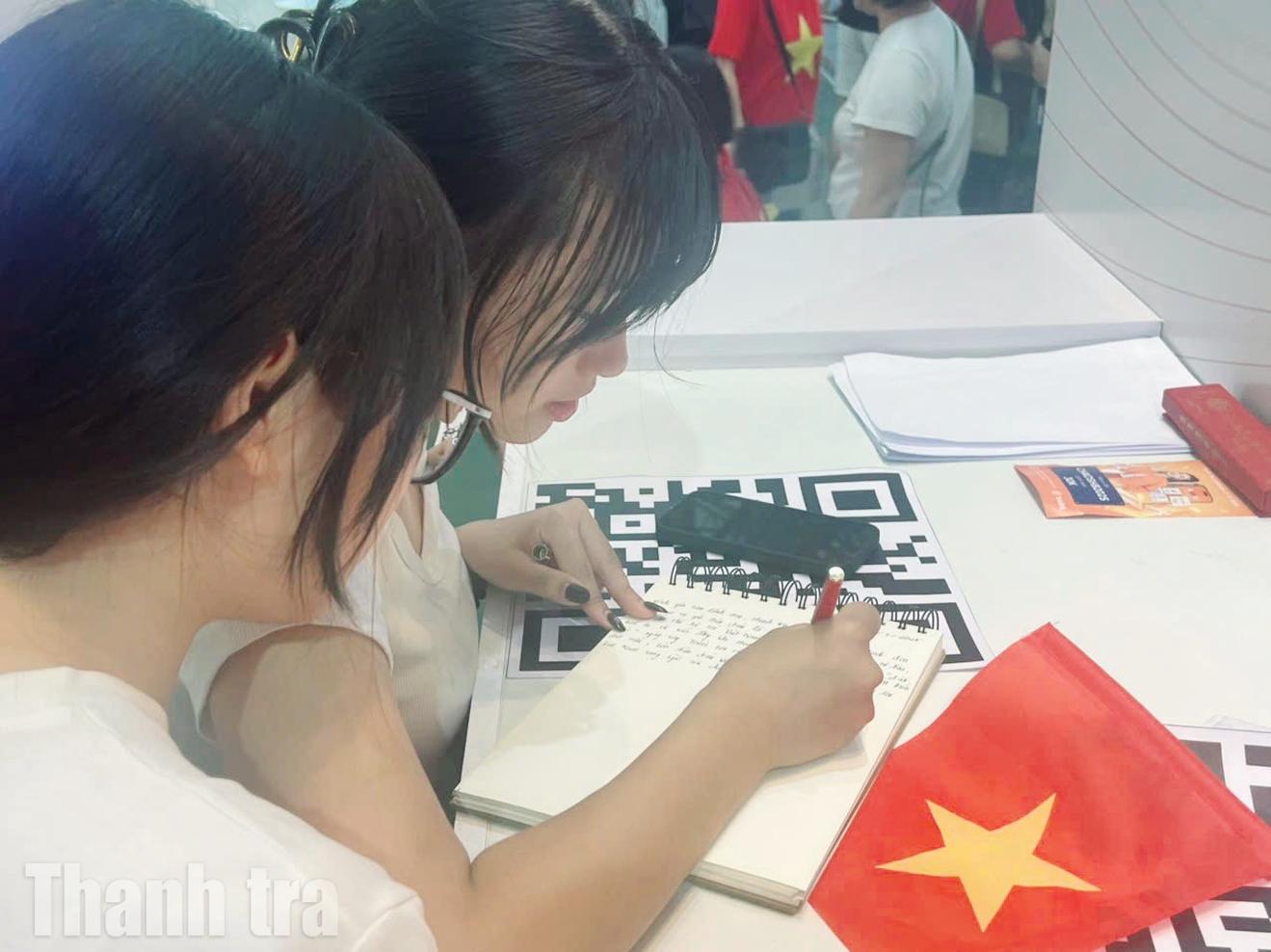 Bạn trẻ Nguyễn Thái Tuệ Minh và bạn nắn nót viết những dòng lưu niệm tại gian triển lãm ngành Thanh tra. Ảnh: Kiên Trung