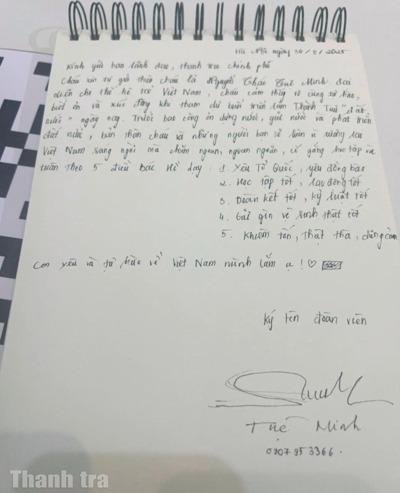 (Thanh tra) - Giữa không gian trang trọng của triển lãm thành tựu đất nước, lời nhắn nhủ giản dị nhưng chan chứa tình cảm của đoàn viên Nguyễn Thái Tuệ Minh đã lay động trái tim nhiều người. “Con yêu và tự hào về Việt Nam mình lắm”, câu chữ mộc mạc ấy không chỉ là tiếng lòng của riêng một em nhỏ, mà còn là nhịp đập chung của cả một thế hệ trẻ Việt Nam đang lớn lên trong hòa bình, được tiếp bước từ truyền thống cha anh để dựng xây một tương lai sáng ngời.
