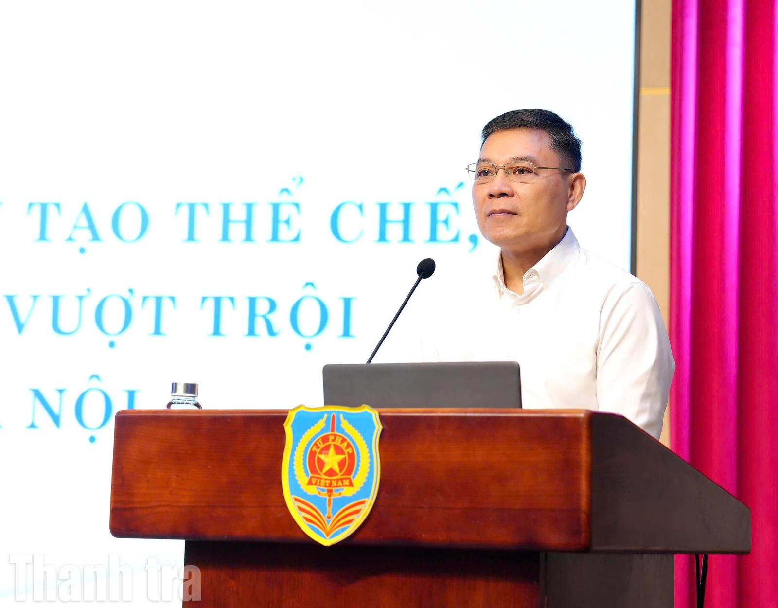 Ông Nguyễn Quốc Hoàn, Vụ trưởng Vụ Công tác xây dựng văn bản quy phạm pháp luật tham luận tại hội thảo. Ảnh: Hương Giang