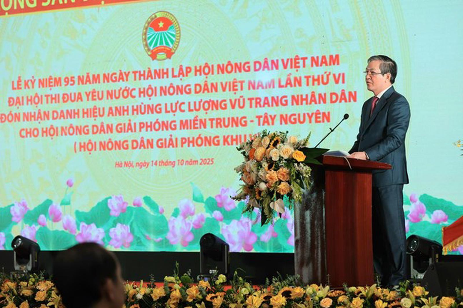 (Thanh tra) - Sáng 14/10, tại Hà Nội, Trung ương Hội Nông dân Việt Nam tổ chức Lễ kỷ niệm 95 năm Ngày thành lập Hội Nông dân Việt Nam (14/10/1930 – 14/10/2025), Đại hội Thi đua yêu nước Hội Nông dân Việt Nam lần thứ VI và đón nhận danh hiệu “Anh hùng Lực lượng vũ trang nhân dân” thời kỳ kháng chiến chống Mỹ cứu nước đối với Hội Nông dân giải phóng khu V.