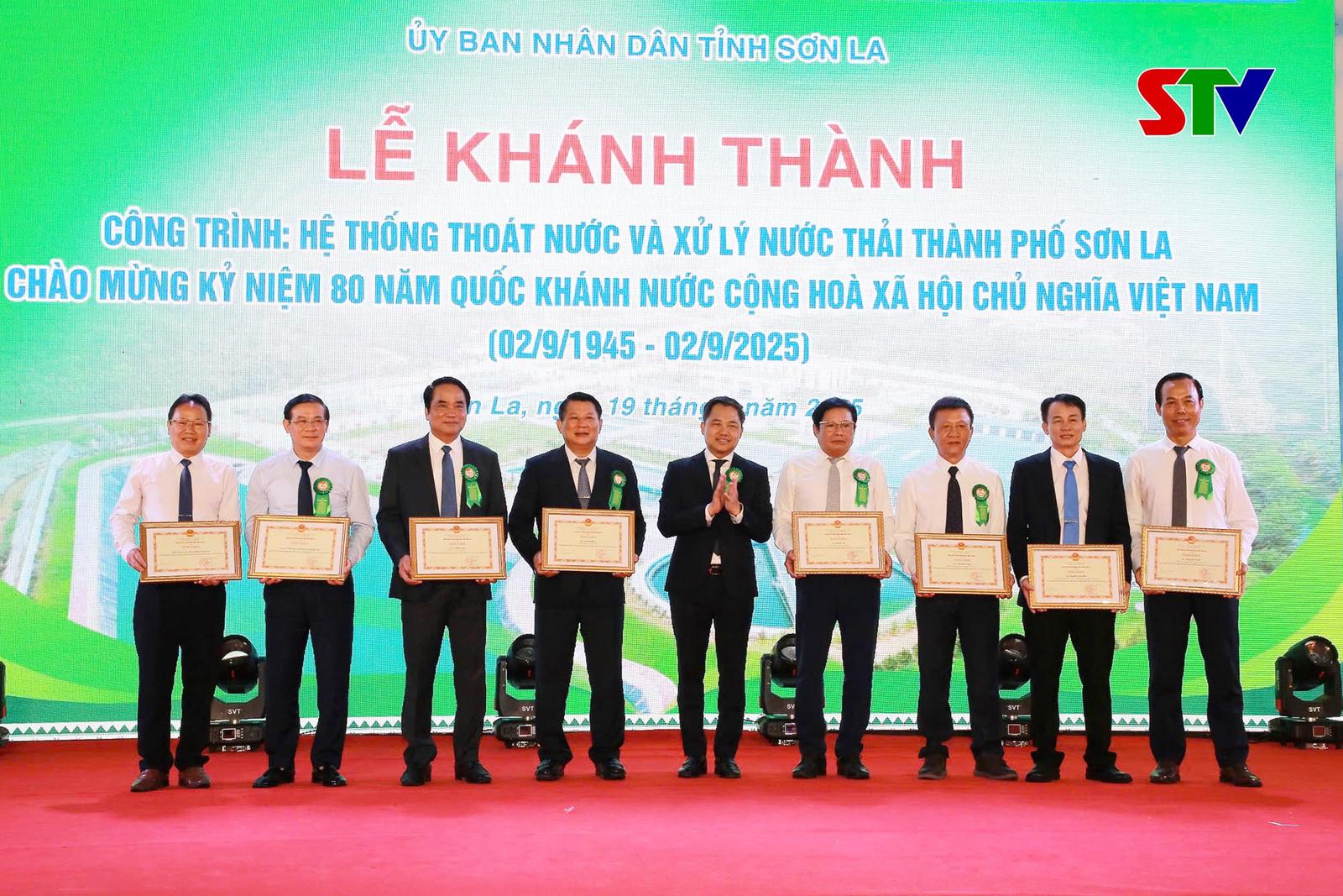 Chủ tịch UBND tỉnh Sơn La Nguyễn Đình Việt trao Bằng khen cho các cá nhân, tập thể tại Lễ khánh thành công trình Hệ thống thoát nước và xử lý nước thải thành phố Sơn La. Ảnh: STV