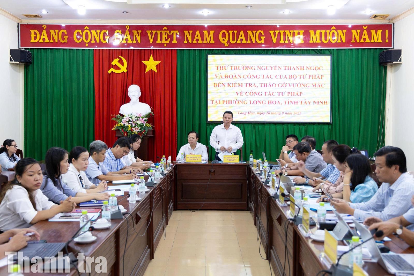 Tham dự buổi làm việc của Thứ trưởng Bộ Tư pháp Nguyễn Thanh Ngọc về tháo gỡ vướng mắc trong công tác tư pháp tại phường Long Hoa có đại diện các cơ quan, đơn vị thuộc Bộ Tư pháp. Về phía tỉnh Tây Ninh, Phó Chủ tịch UBND tỉnh Đoàn Trung Kiên, lãnh đạo các sở, ban, ngành tỉnh và lãnh đạo Đảng ủy, UBND phường Long Hoa đã tiếp và làm việc với Đoàn công tác của Bộ Tư pháp.